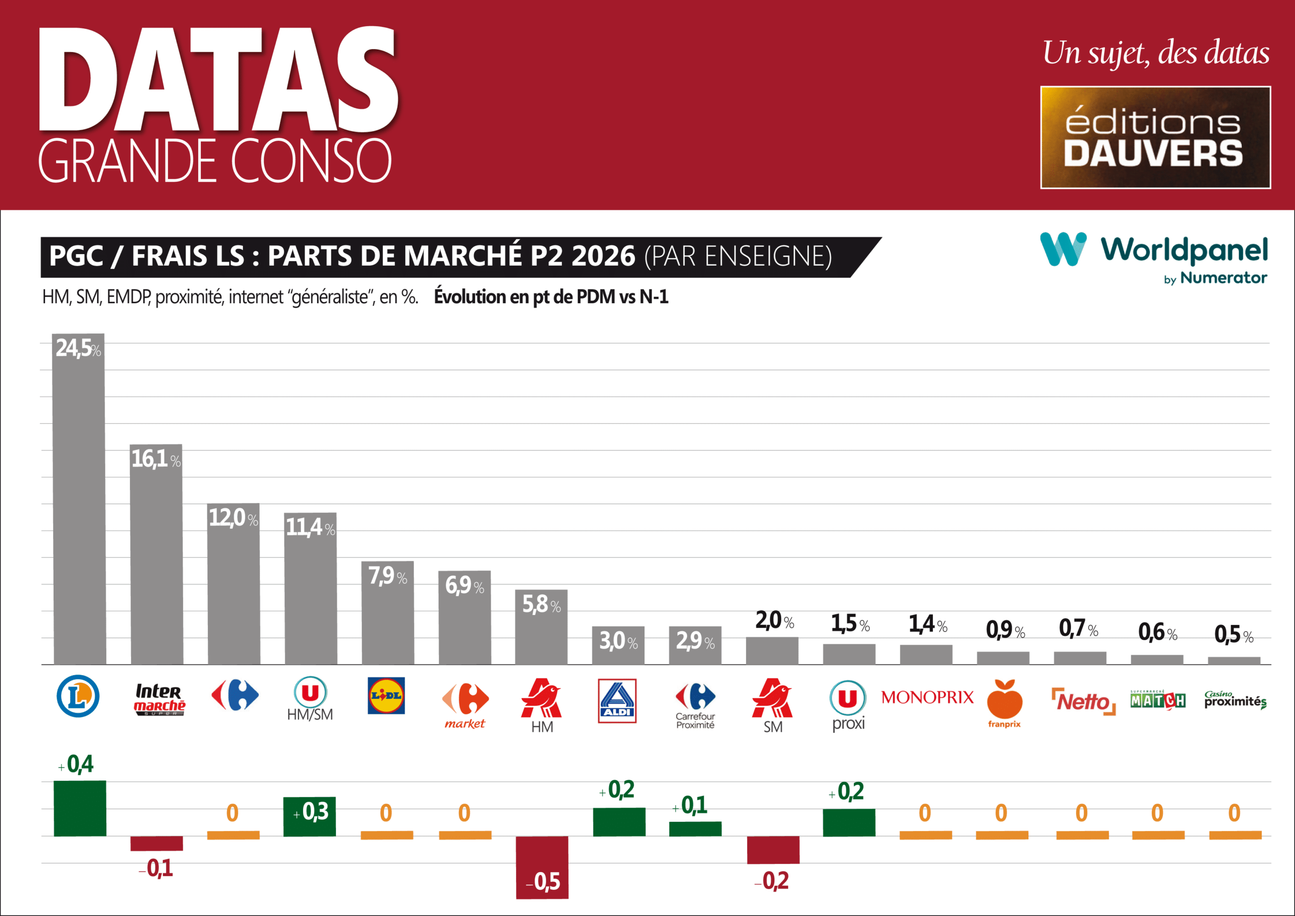 Les chiffres peuvent varier, pas les directions. Après NielsenIQ avant-hier (revoir ici), publication cet après-midi des parts de marché P2 selon Worldpanel. Et résultats similaires. Deux grands vainqueurs : Leclerc et U. Un perdant : Auchan. Dans le détail, Coopérative U s’arroge la plus forte progression (+ 0,6 pt), mais…