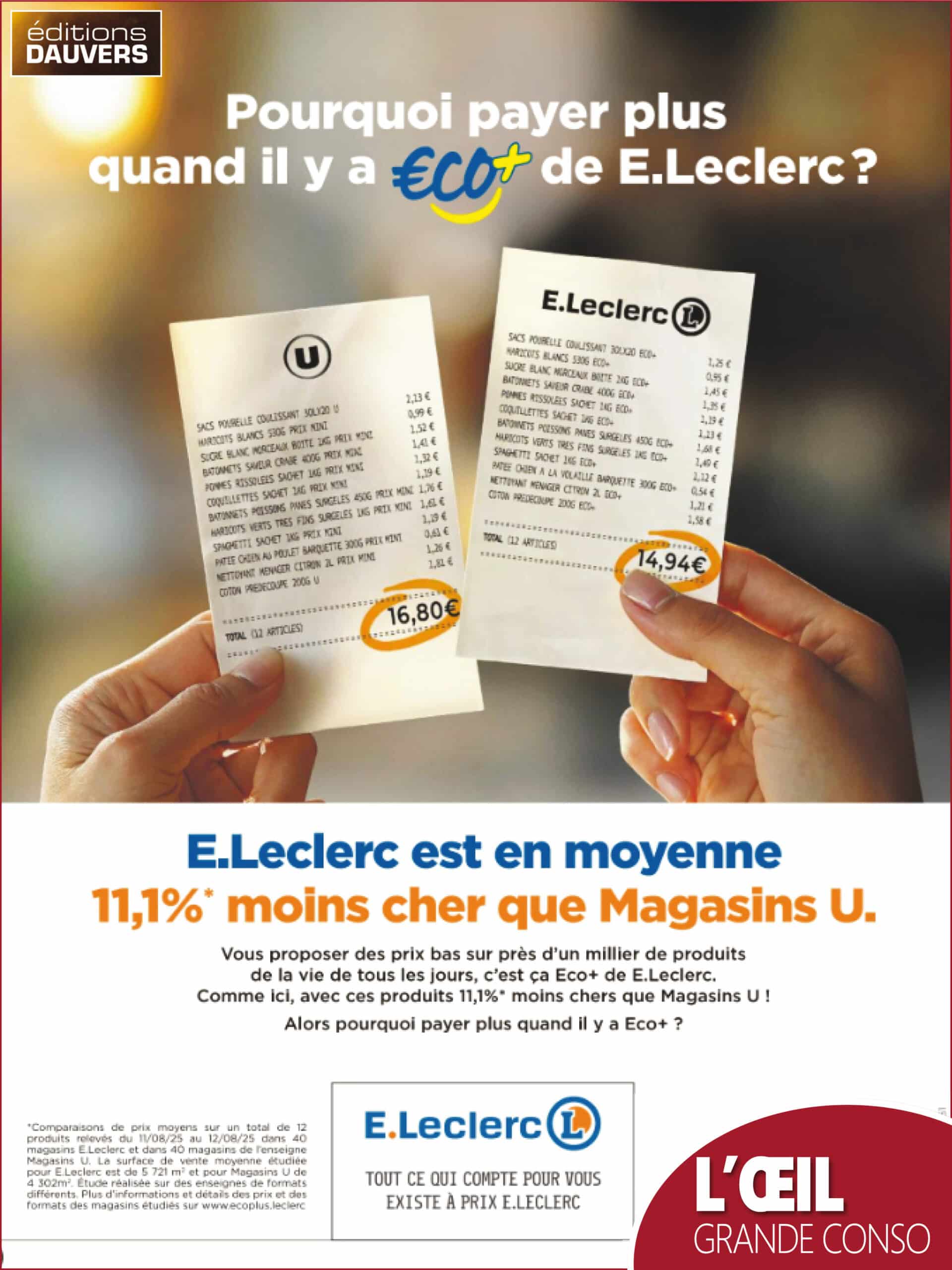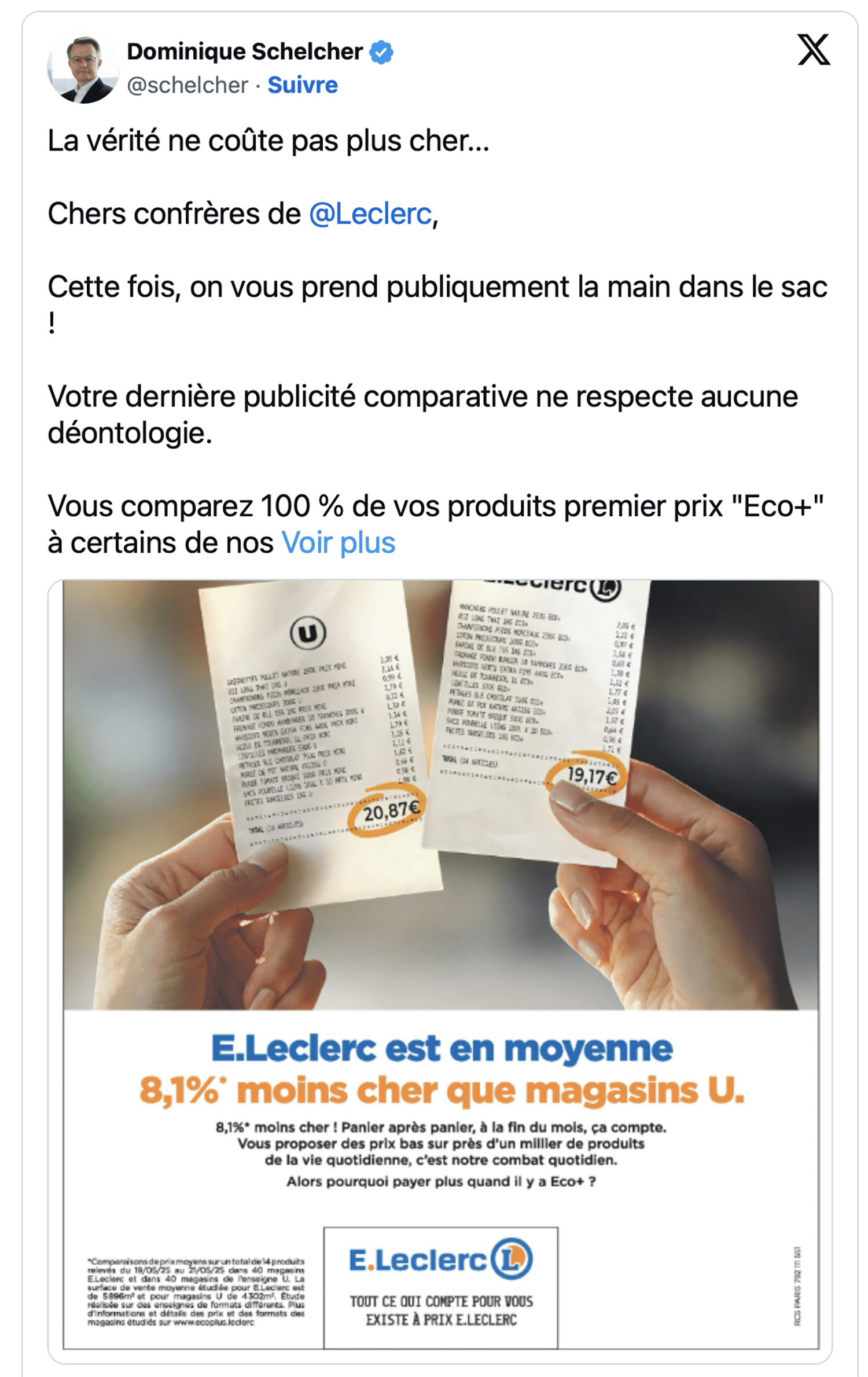 En juin dernier, la première salve avait donné lieu à une réponse sèche (euphémisme) de Dominique Schelcher, patron des U, à l’encontre de Michel-Édouard Leclerc (revoir ici ou le tweet ci-dessous évoquant ma propre position : “même le très sérieux Dauvers70…” 😂)… Bis repetita à présent ! Dans le visuel publicitaire du jour, Leclerc compare à nouveau ses premiers prix Éco + aux produits U. C’est le cas pour les sacs poubelle (la première ligne du ticket de caisse) et pour le coton prédécoupé (la dernière ligne). Leclerc considère donc sa comparaison licite dès lors que les caractéristiques des produits sont identiques. Sans doute. De mon côté, je maintiens que la valeur (certes immatérielle) d’une marque est un élément suffisamment distinctif pour ne pas comparer MDD et premier prix. Mais je ne suis pas juge, juste libre observateur qui partage ses pensées (qu’elles plaisent ou non).