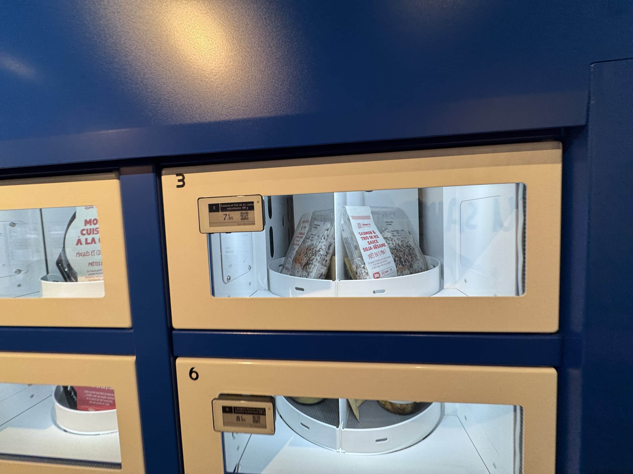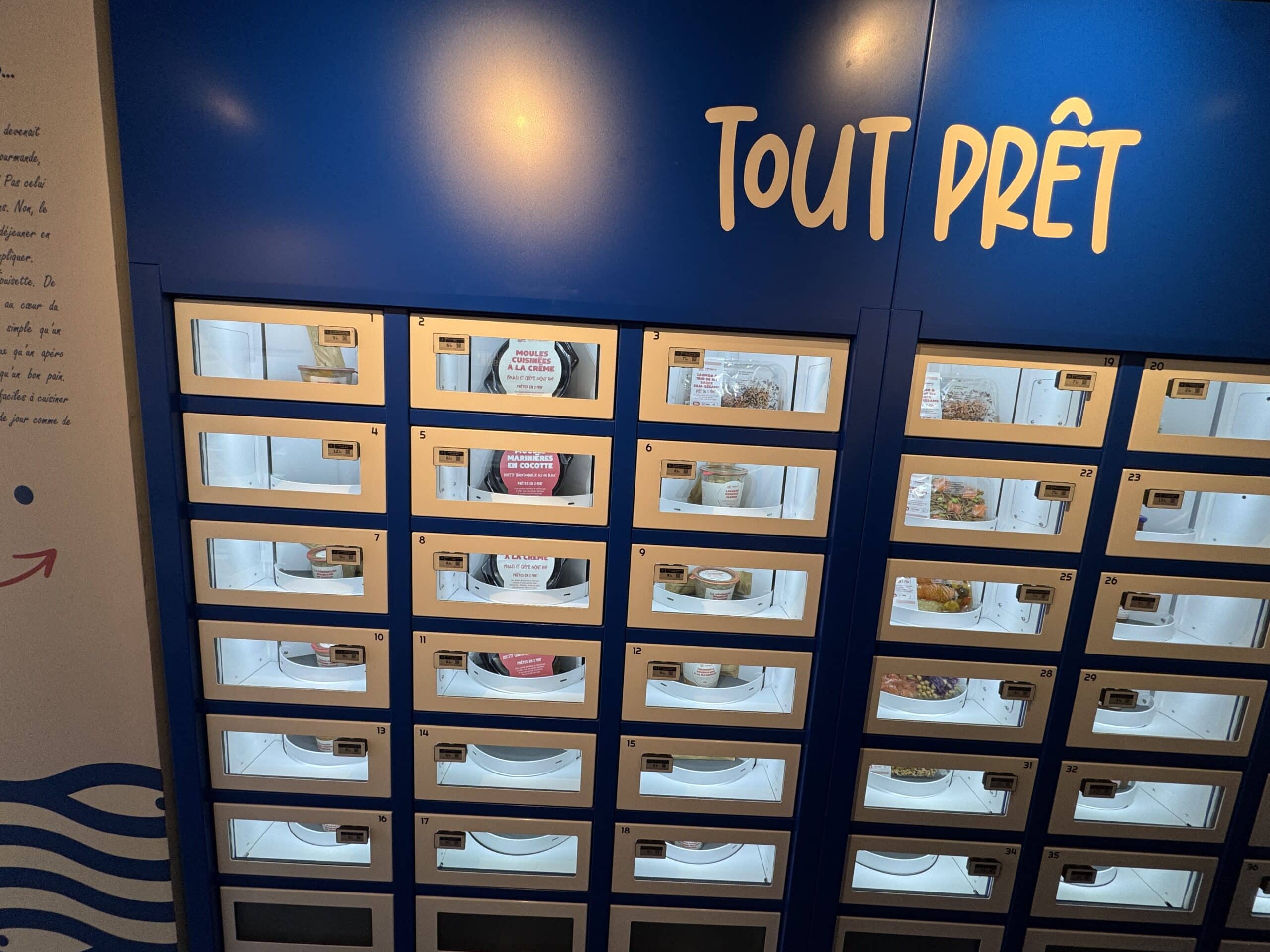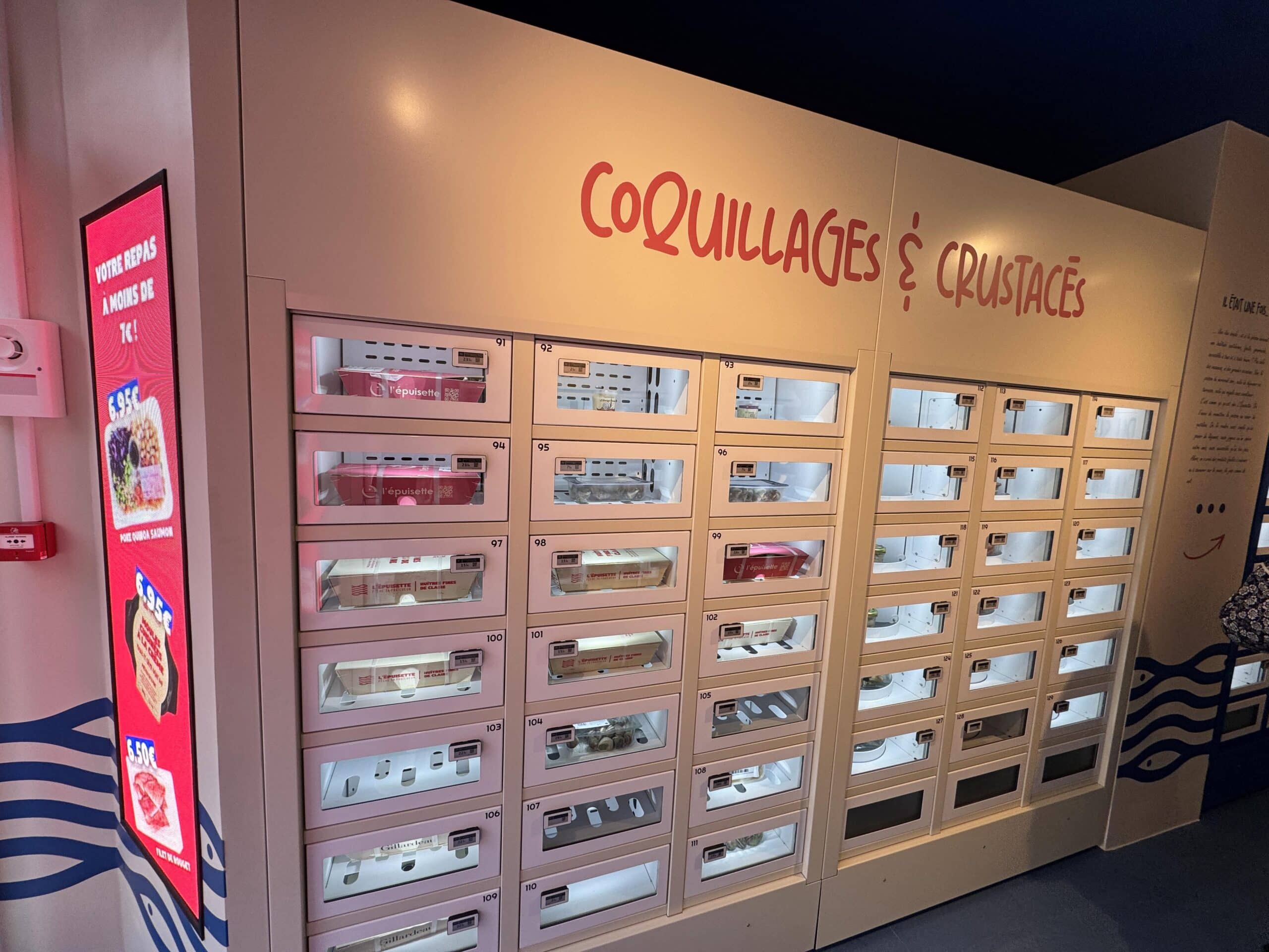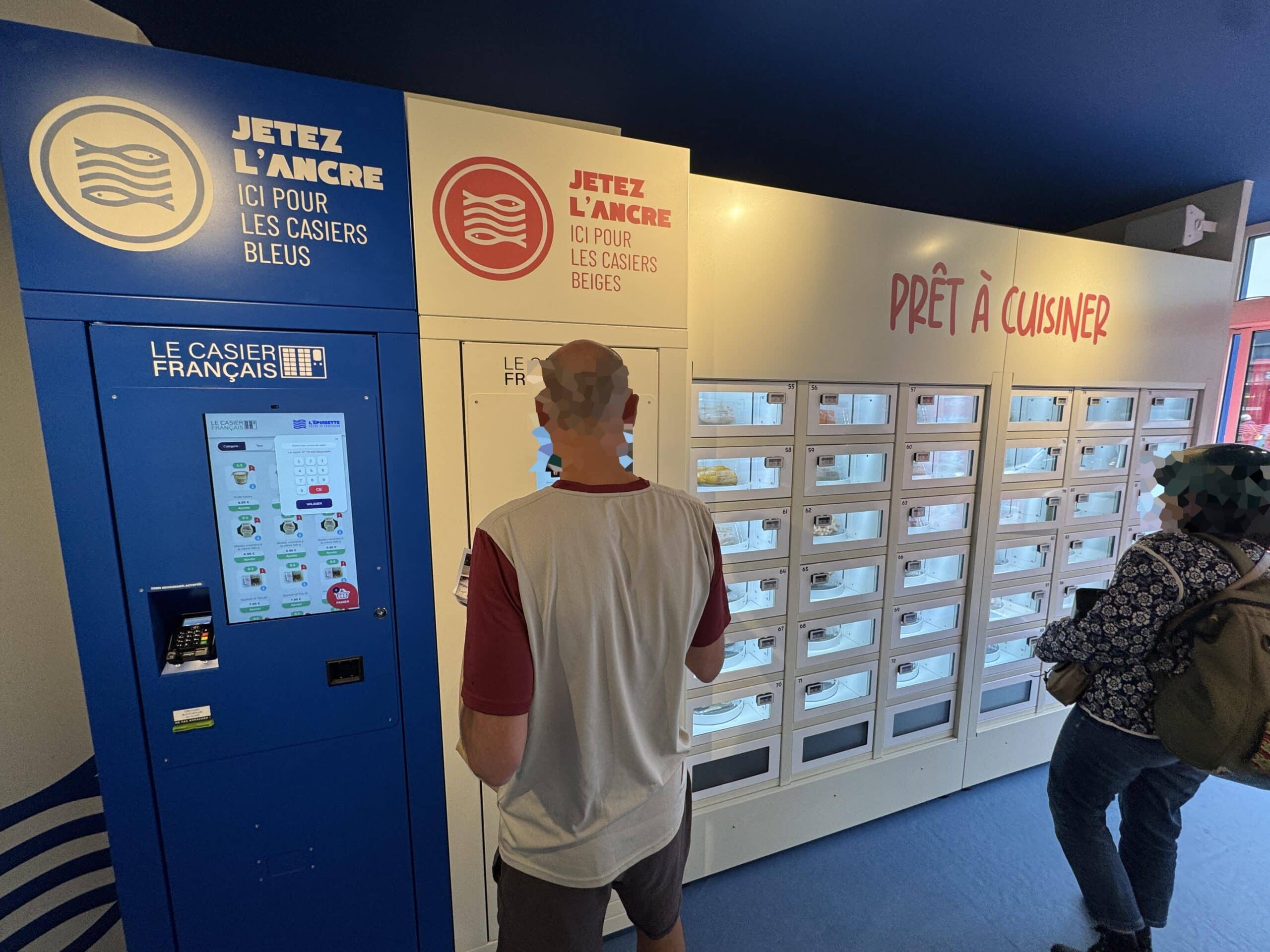 A l’intérieur, environ 350 casiers en libre-service, pilotés depuis une borne tactile (choix, paiement). Dans les casiers : des filets de poisson, des coquillages, des plats cuisinés et quelques conserves Belle-Iloise (voir l’offre ici). Originalité (vous le découvrirez dans les photos qui suivent) : des plateaux tournants, partagés en deux, pour doubler le stock disponible. Malin.