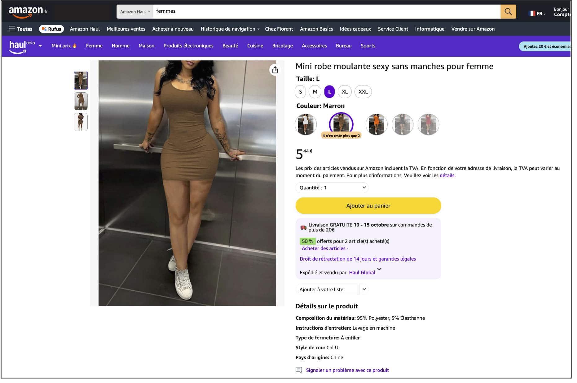 Les illustrations « cheap » (photos racoleuses, prises de vue peu soignées, mises en scène basiques, etc.) et les bandeaux colorés animés « Il n’en reste plus que X » font partie de l’univers des plateformes chinoises et, de ce point de vue, Amazon s’inscrit bien dans les codes ! Les fidèles de Temu ne seront pas dépaysés et c’était bien le but recherché.