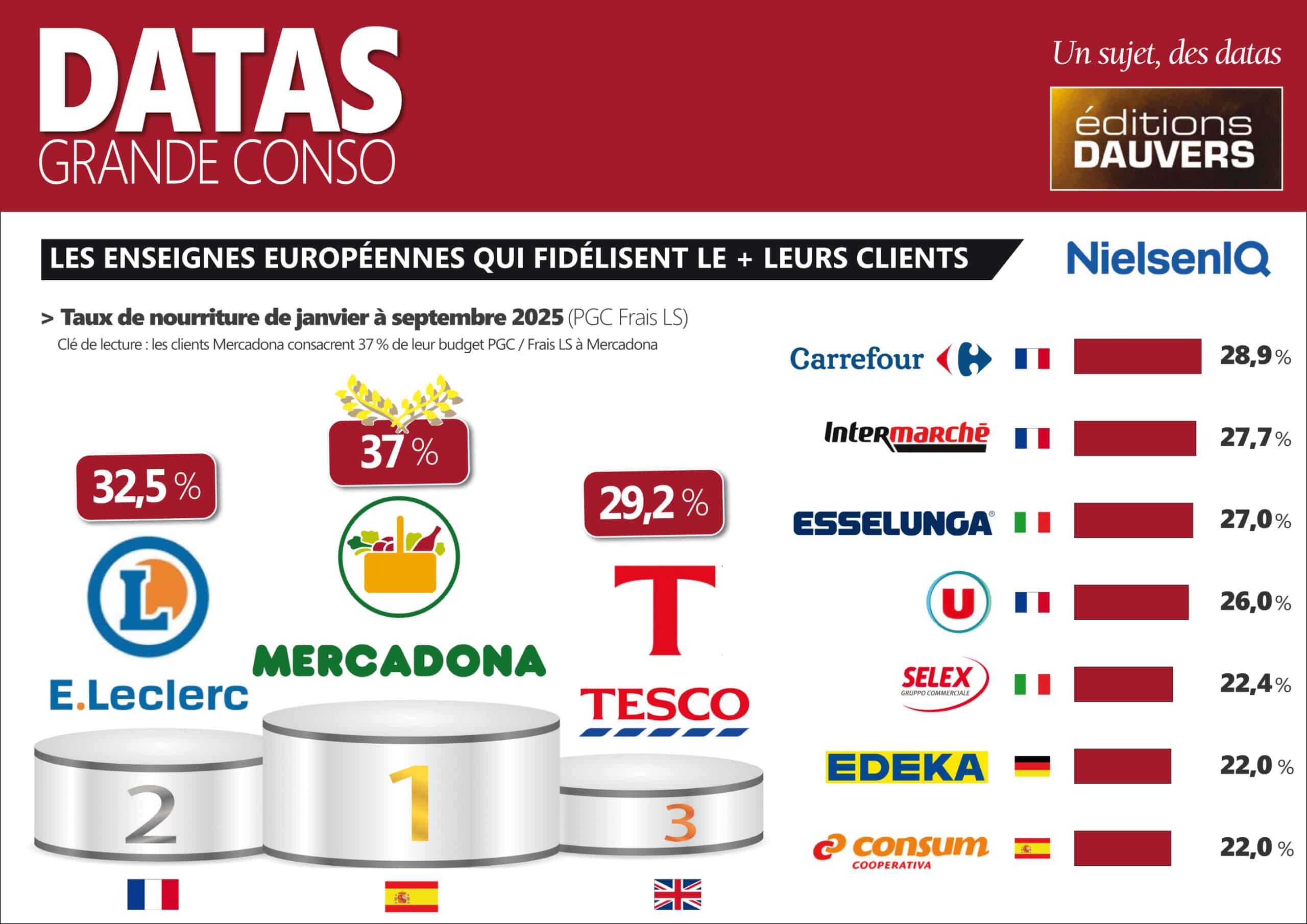 Dimanche infographie, première salve avec le Top 10 des enseignes européennes les plus fidélisantes. Dit autrement : celles qui captent le plus des dépenses alimentaires de leurs clients (indépendamment de leur part de marché totale, elle-même conséquence du parc). A ce jeu, c’est une nouvelle fois Mercadona qui est sur la plus haute marche du podium établi par NielsenIQ (c’était déjà le cas l’an dernier). Les clients Mercadona consacrent 37 % de leurs dépenses à l’enseigne. A défaut d’avoir le Top 1 européen, le retail français se consolera d’être le mieux représenté : 4 enseignes dans le Top 10 ! Dans l’ordre : Leclerc, Carrefour, Intermarché et U. Cocorico !