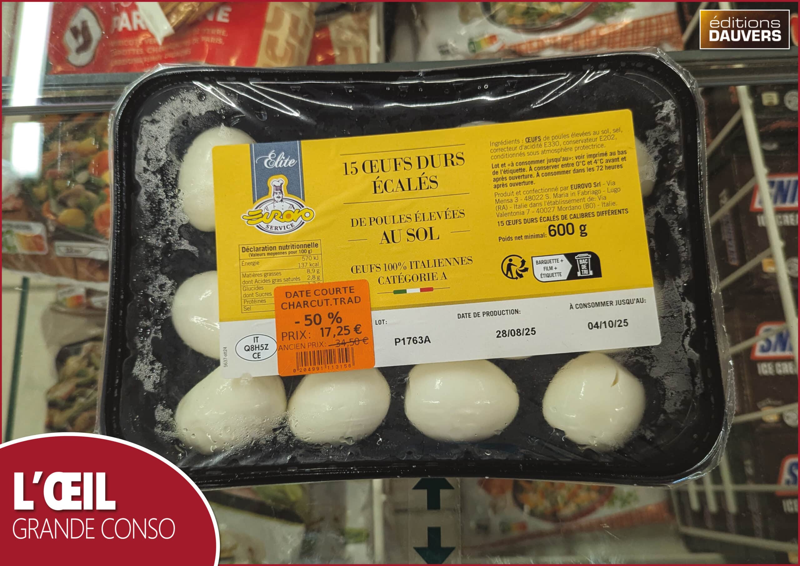 J’ai connu U plus inspiré… Parce que vendre des œufs durs écalés (et pas même français) à plus de 50 € le kilo, il fallait quand même avoir une foi inébranlable pour imaginer que ça finirait ailleurs que dans le bac anti-gaspi. Regardez bien l’étiquette : 34,50 € le prix initial pour 15 œufs durs. 2,30 € l’œuf, soit plus que le prix d’une boite de 6 version bio. Il était quand même assez probable que ça ne trouve pas complètement son public. #euphémisme.