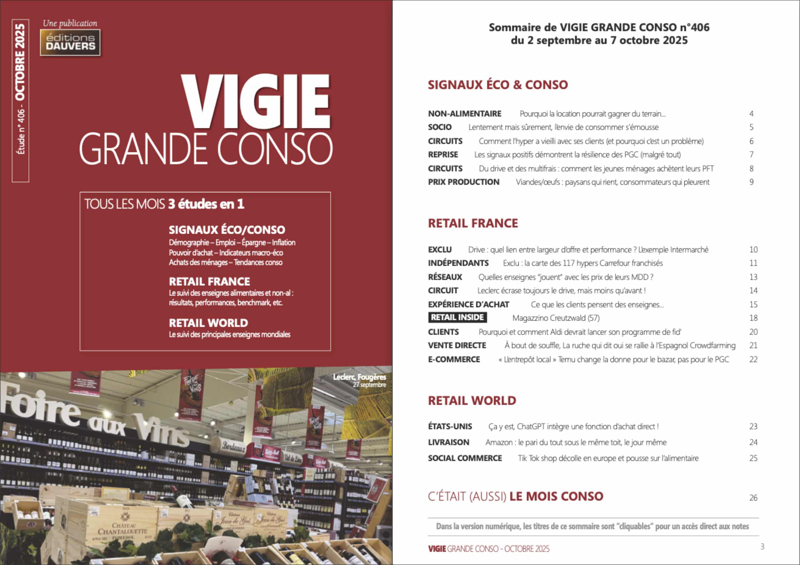 Zoom sur le sommaire de VIGIE GRANDE CONSO d’octobre, n°406, diffusé cette semaine. VIGIE est le mensuel de référence sur le retail que nous publions depuis plus de 15 ans. Notre ambition ? Le plus haut niveau d’analyse et des études garanties 100 % inédites.