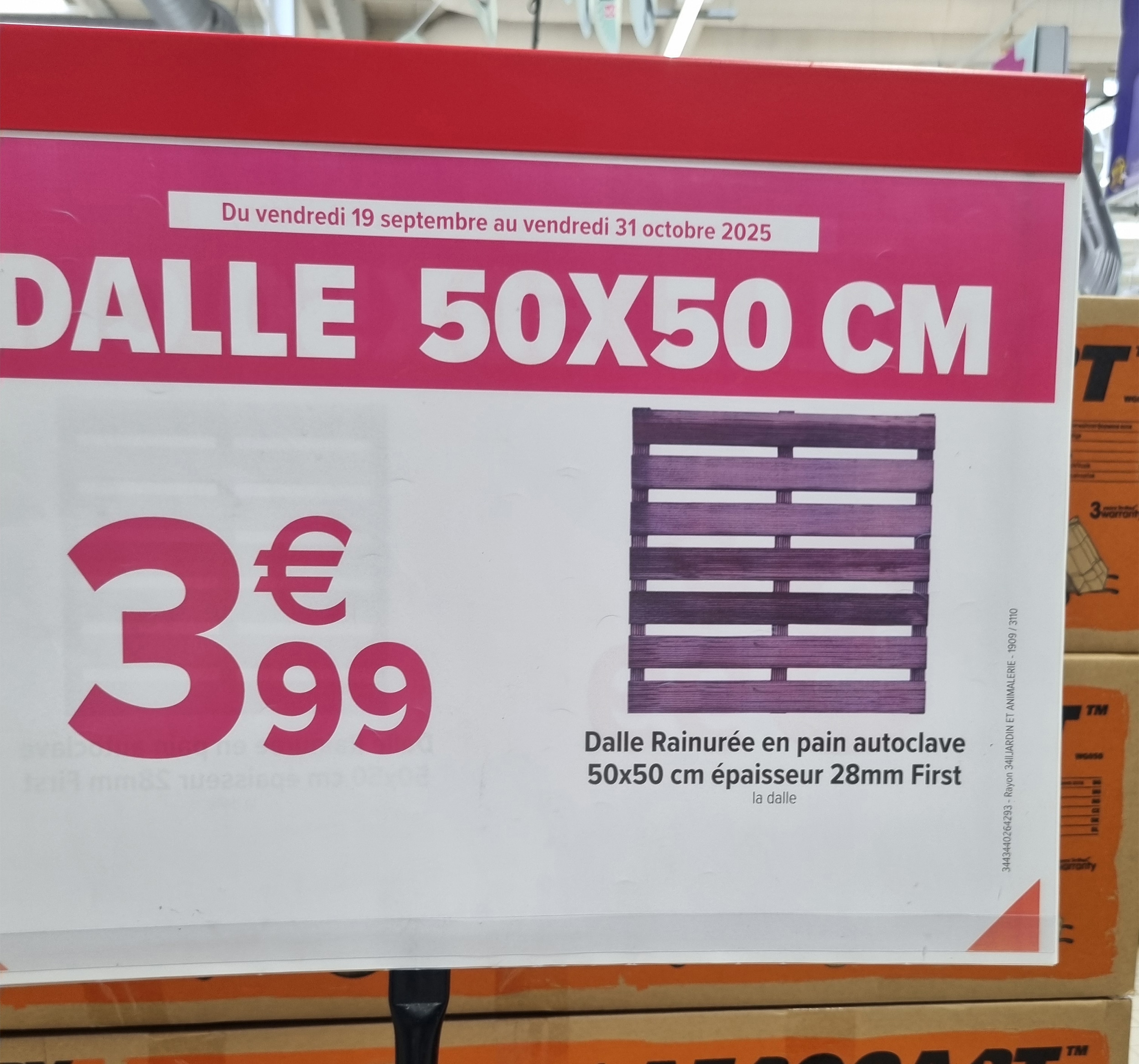 Carrefour. Promo sur les dalles en… « pain ». Sans doute pas très résistantes. Ça risque de s’émietter, non ? Évidemment, vous lavez toujours !