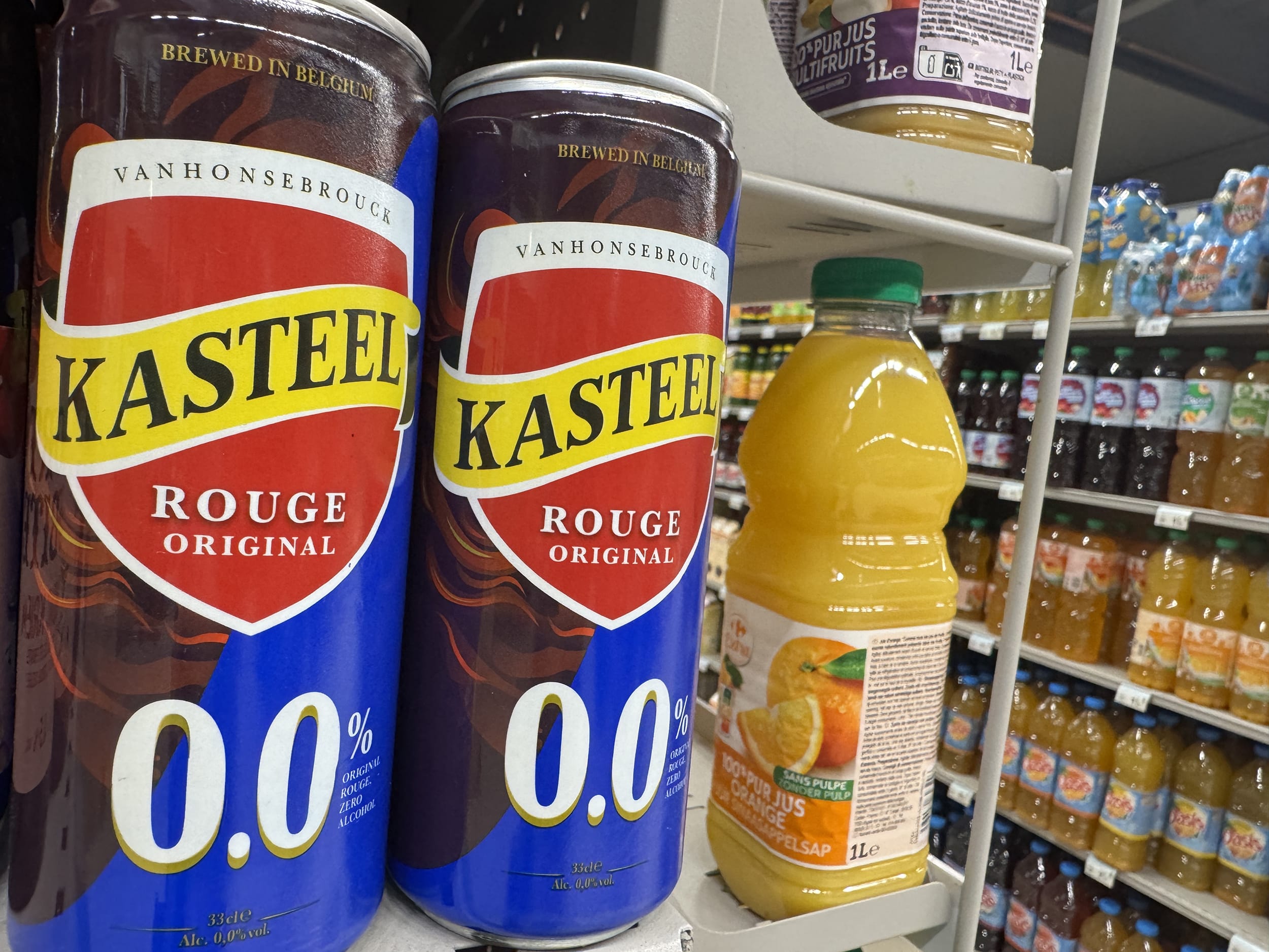 Fin de journée en Mayenne : Carrefour Market Changé. « Rouge 0.0 % ». De la bière, pas du vin, hein… Je précise parce que y’a rien d’évident (hormis un “brewed in belgium” que n’auront peut-être pas saisi tous les clients).
