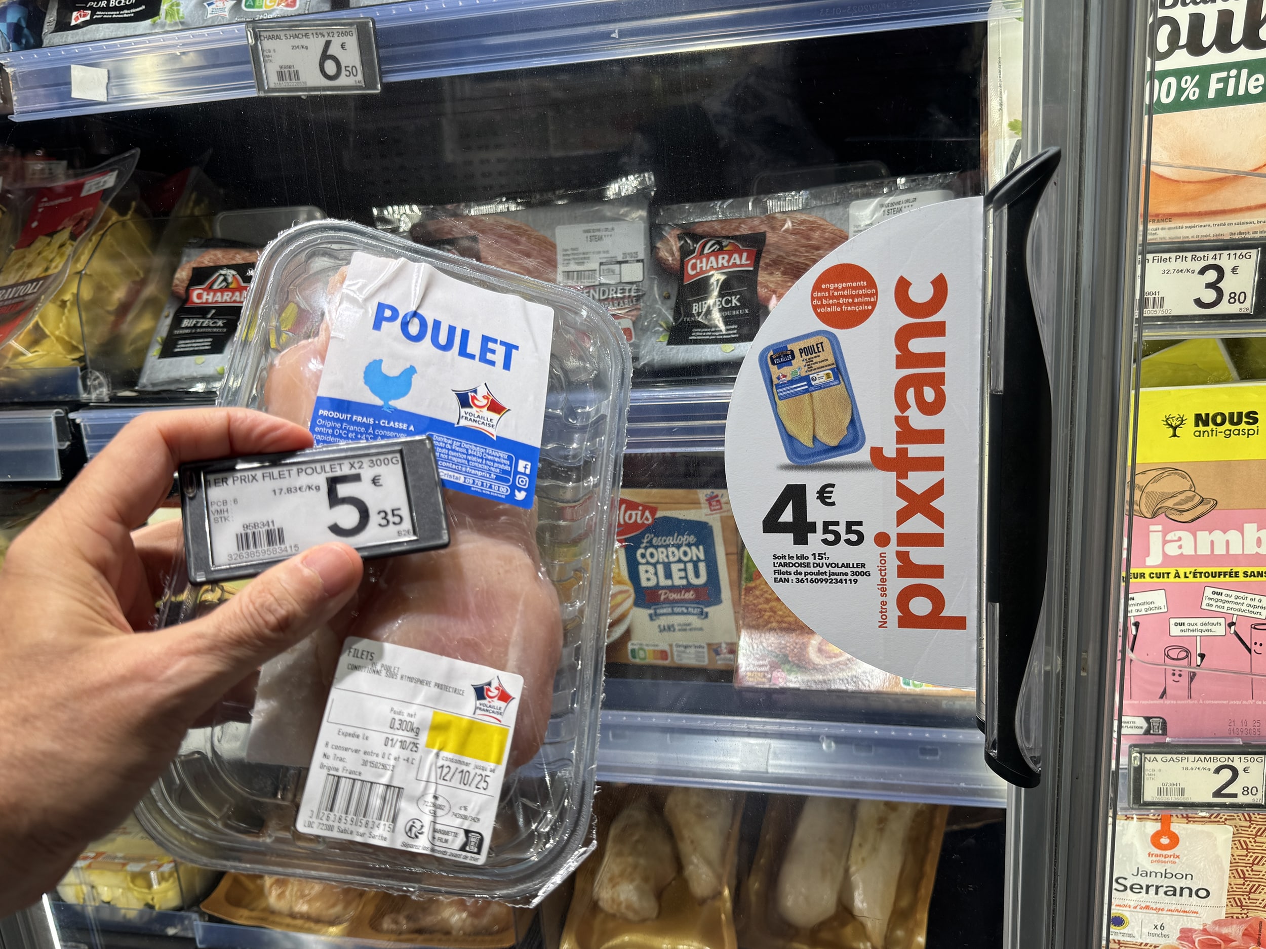 Le prix « franc » chez Franprix (est un prix qui vieillit mal). 4,55 € les filets de poulet sur la poignée de porte, 5,35 € sur l’étiquette électronique. Ne jamais faire cohabiter affichage prix papier et électronique, épisode 12 729.