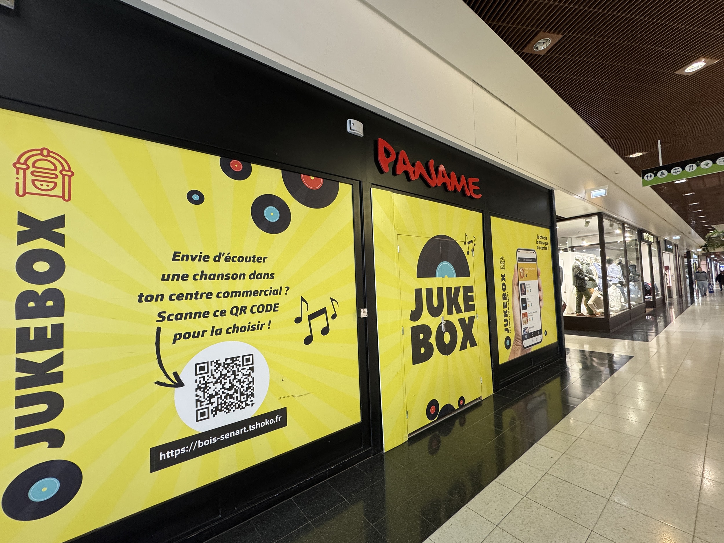 Centre commercial Auchan Melun (77). « Envie d’écouter une chanson dans ton centre commercial ? Scanne ce QR code pour la choisir ». Et comment… « 3 nuits par semaine » à fond dans les allées, ça pourrait le faire…
