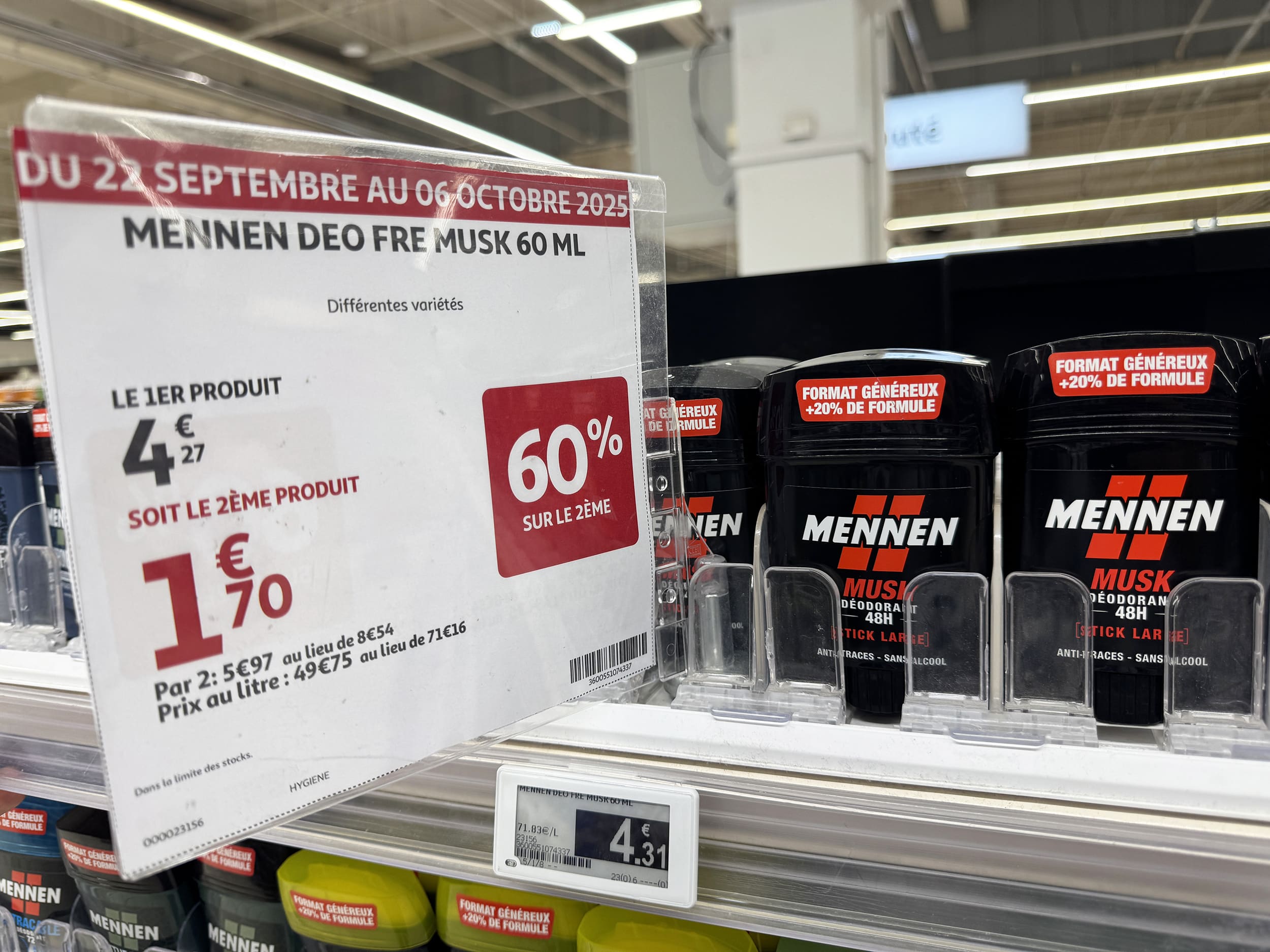 Mennen Musk ? 4,27 € sur l’affichette, 4,31 € sur l’étiquette électronique. Ne jamais faire cohabiter affichage prix papier et électronique, épisode 12 730. Je sens bien la farandole de prix Auchan qui s’avance…