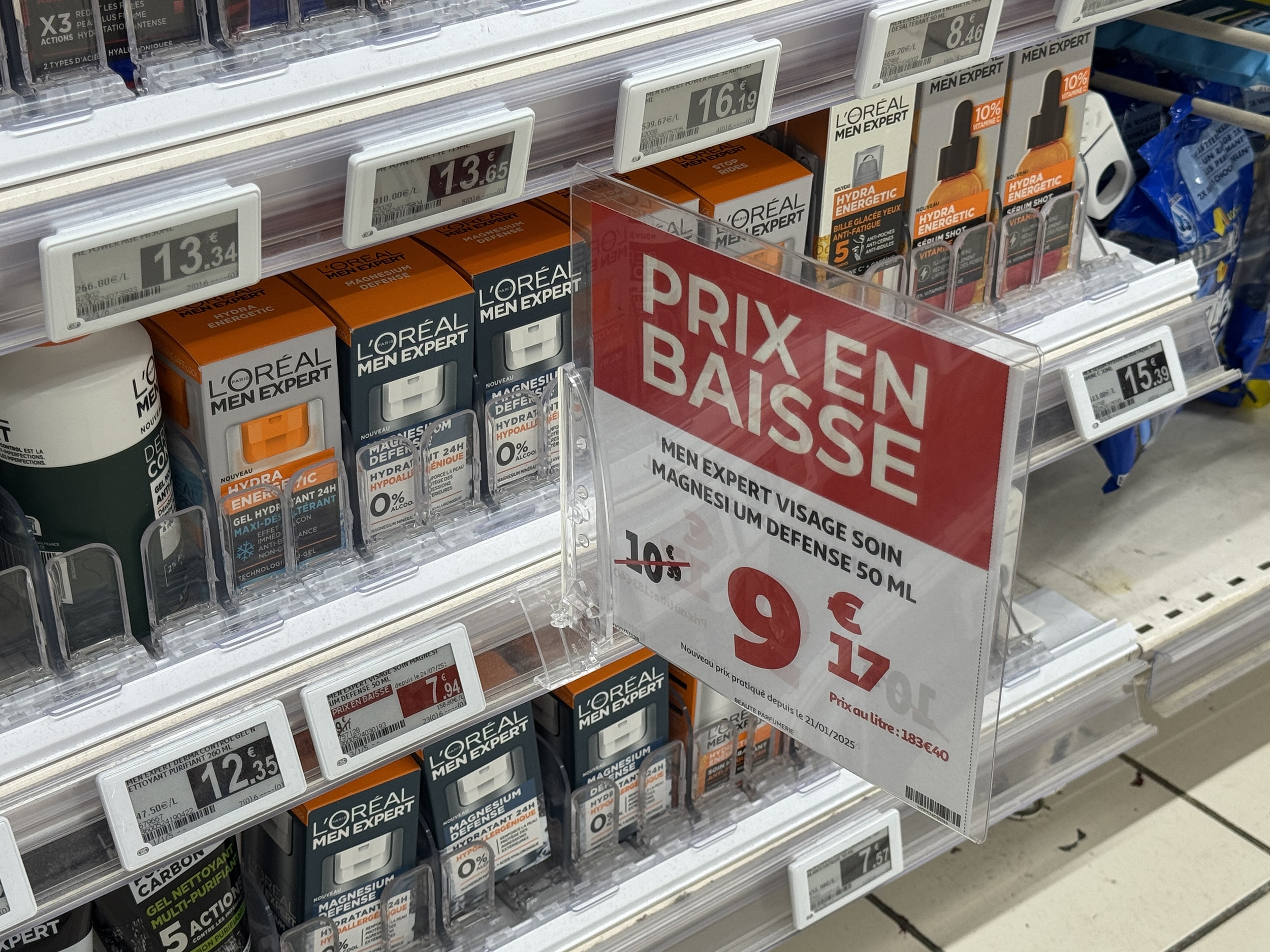Gagné ! Men Expert visage soin ? 9,17 € sur l’affichette, 7,94 € sur l’étiquette électronique. On joue encore ?
