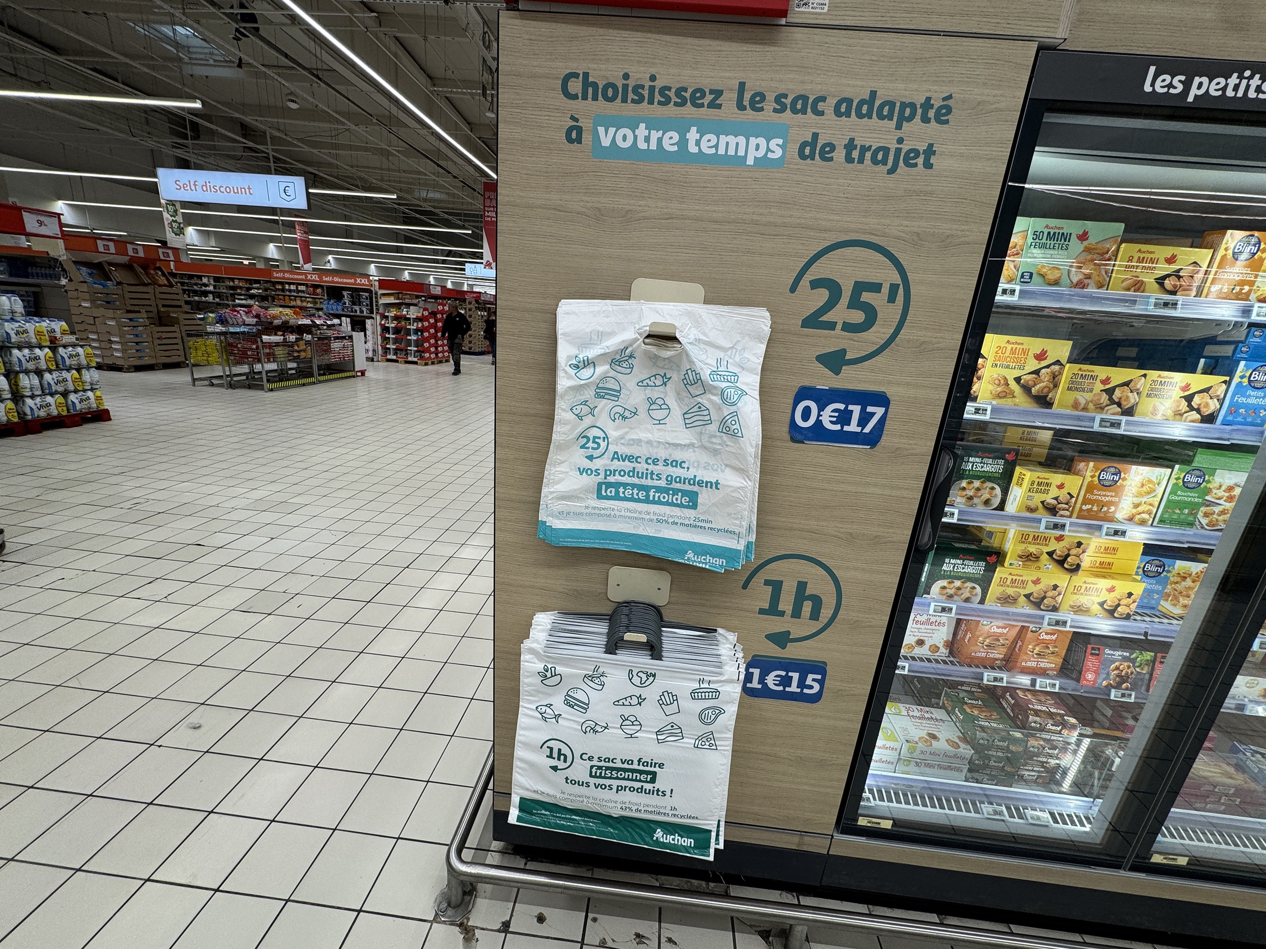 « Choisissez le sac adapté à votre temps de trajet ». 25 minutes ou… 1 h ! Souvenir d’un temps (que les moins de 20 ans ne peuvent pas connaître) où l’hyper « tirait » de loin… 1 h de trajet (même avec des détours), ça fait rêver