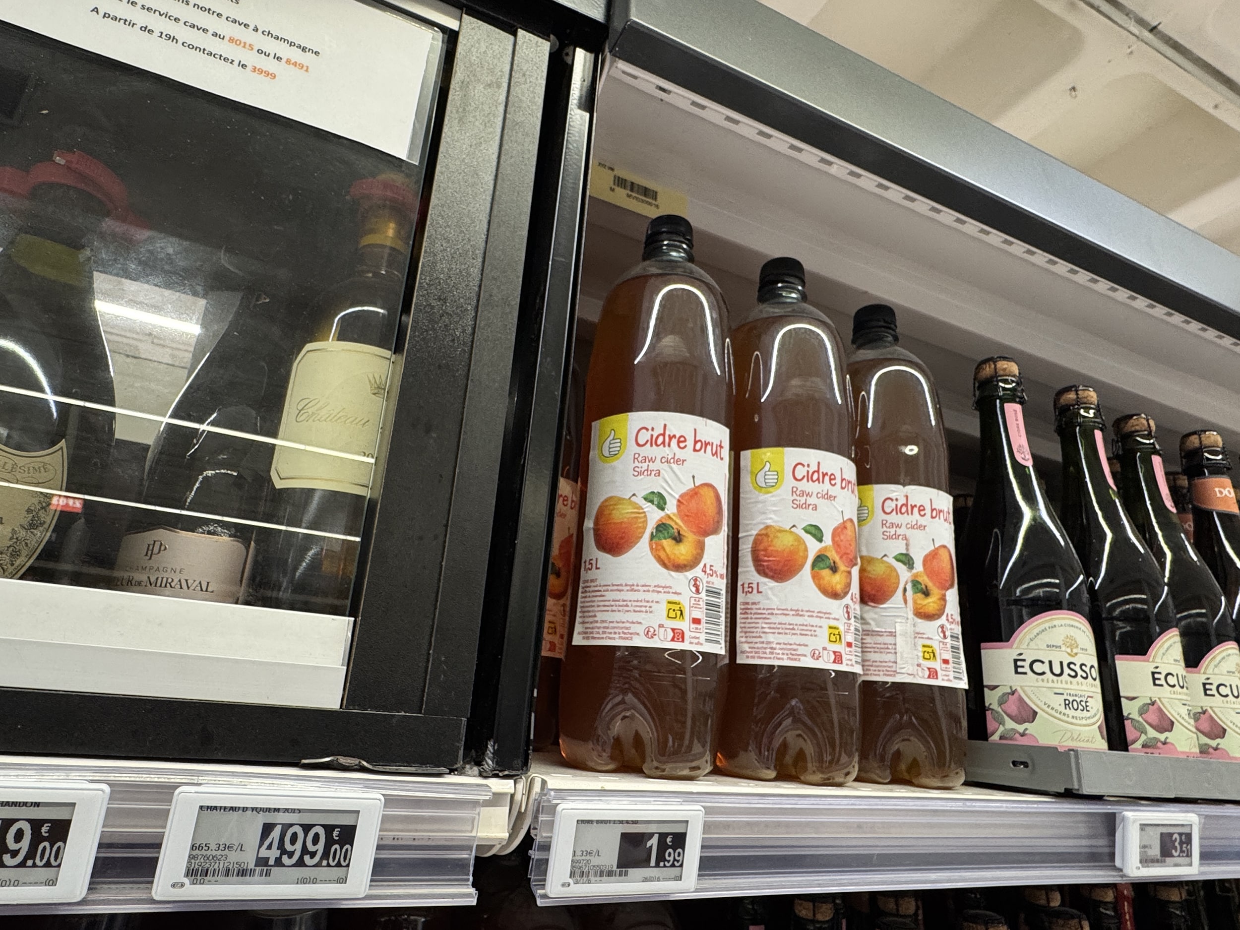 Les mystères du merchandising. A gauche, une « quille » d’Yquem à 499 €. A droite, 1,5 litre de cidre premier prix pour 1,99 €.