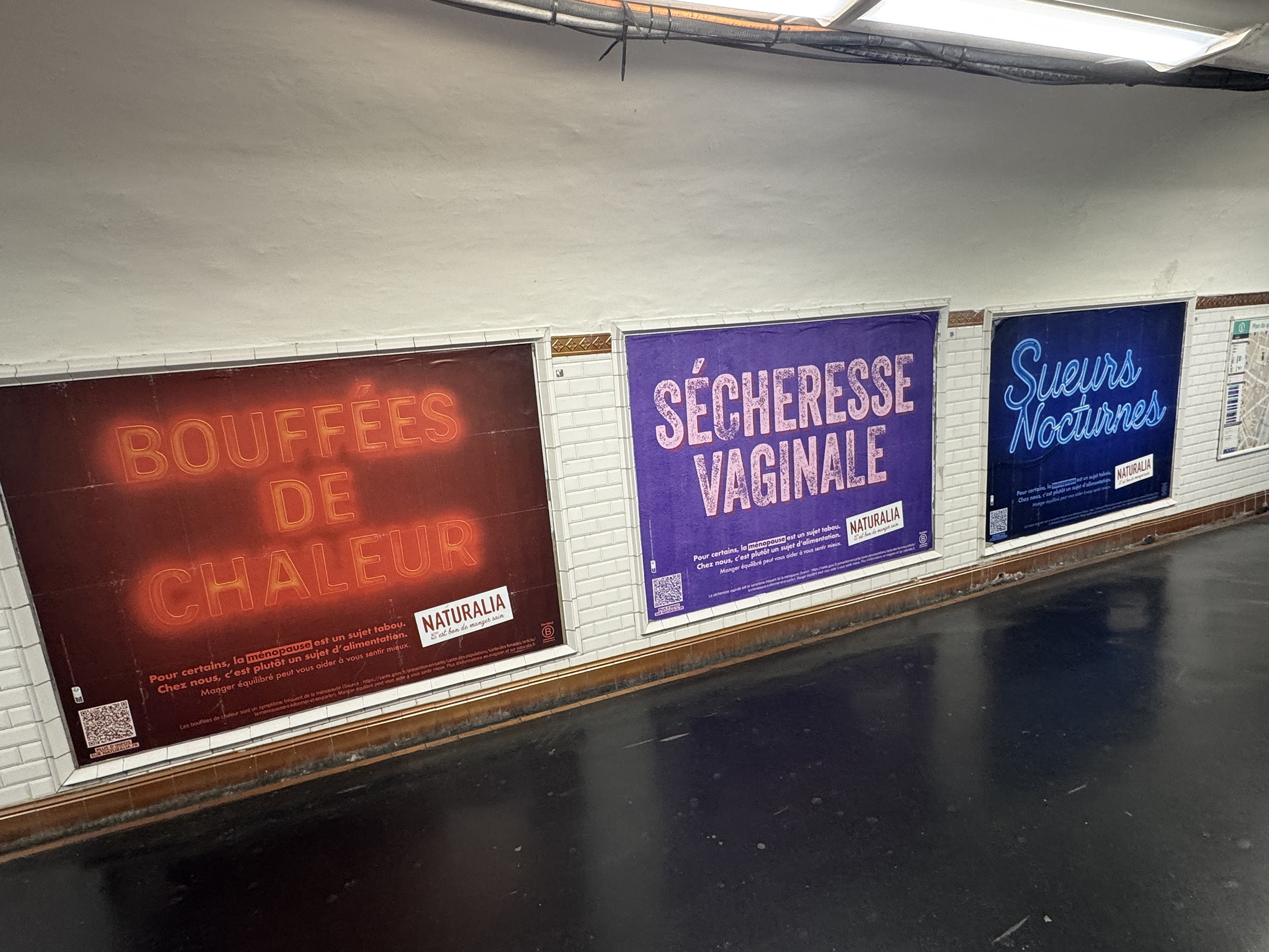 « Bouffées de chaleur », « sécheresse vaginale », « Sueurs nocturnes ». A 6h du mat’, dans le métro (sur le chemin de la radio), ça surprend ! Évidemment, Naturalia raccroche le sujet (en l’occurrence la ménopause) à sa proposition commerciale : “Pour certains, la ménopause est un sujet tabou. Chez nous, c’est plutôt un sujet d’alimentation. Manger équilibré peut vous aider à vous sentir mieux”. On est quand même à 2 doigts de l’allégation santé, non ? Je n’ose imaginer le tollé si la même campagne avait été signée Leclerc, Carrefour ou Auchan…