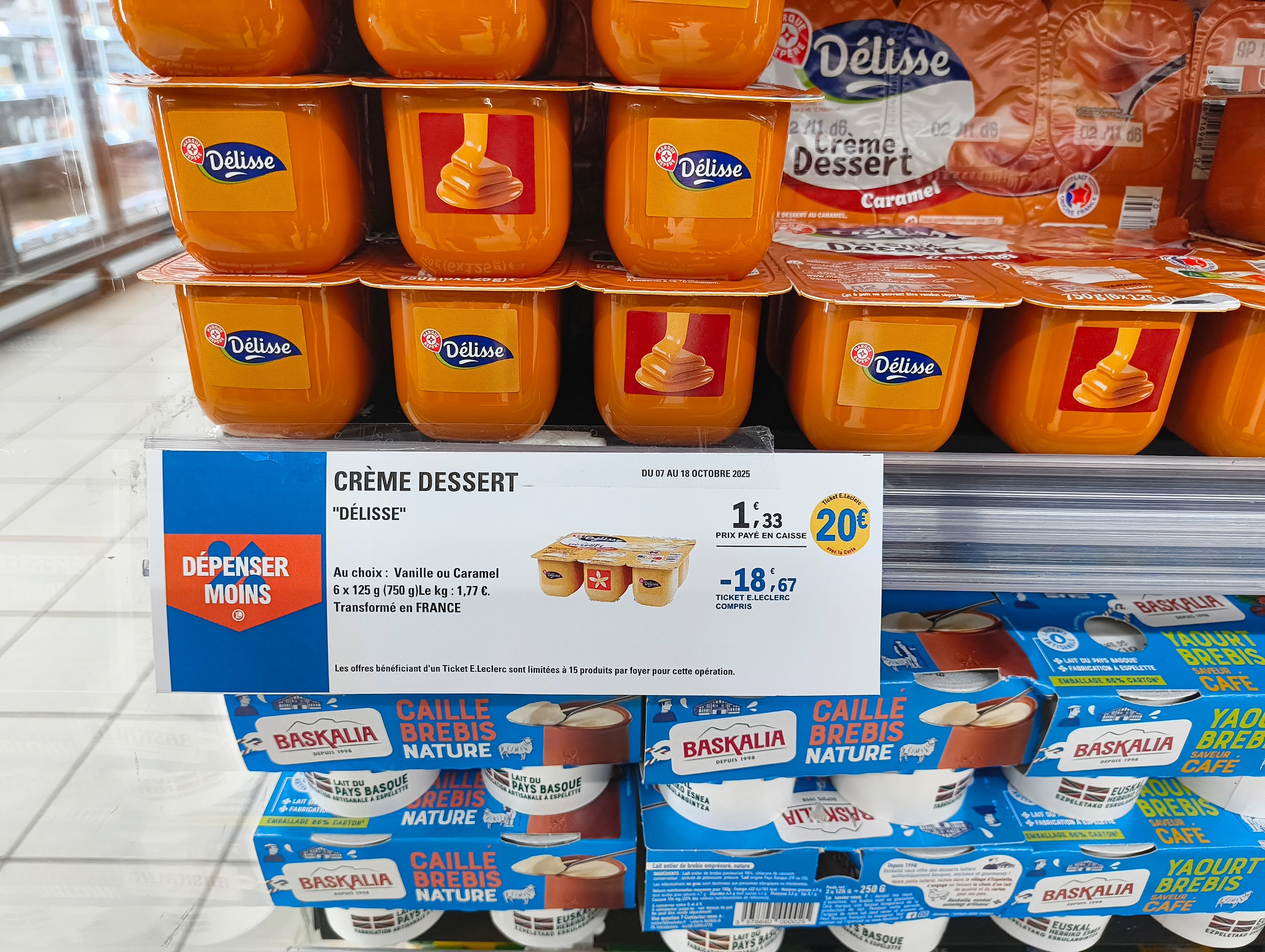 Chez Leclerc. Un pack de crème dessert à 1,33 € acheté, 20 € crédité sur la carte de fidélité. Voilà enfin la vraie redistribution de pouvoir d’achat. Michel-Édouard Leclerc président !!!