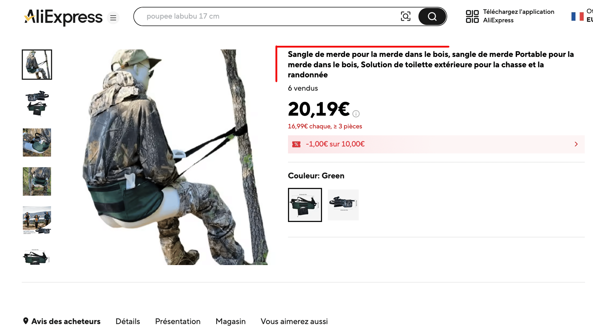 On termine par une idée shopping. Sur Aliexpress : « la sangle de merde pour la merde dans le bois ». Je vous laisse imaginer l’usage (parce qu’il y en a un évidemment…). Magie des agents de traduction boostés à l’IA.