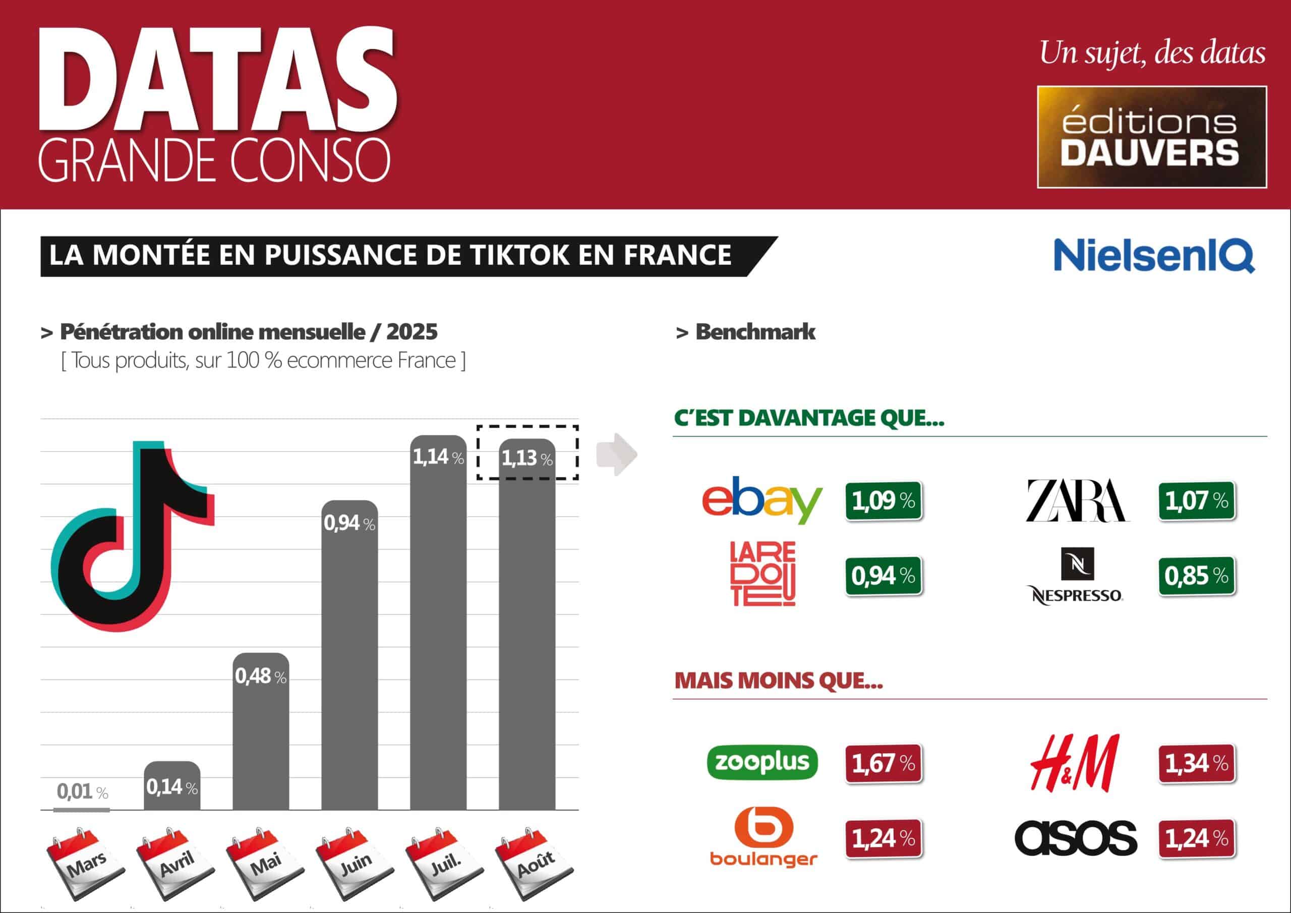 Au menu de “Dimanche infographie” : la montée en puissance de TikTok dans le shopping on-line. Selon NielsenIQ, le taux de pénétration a dépassé 1 % pendant l’été. Faible en apparence ! Mais, comme souvent, rien de tel qu’un p’tit benchmark pour relativiser. En quelques mois à peine, la fonction shopping du réseau social a déjà dépassé ebay ou Zara ! En quelques mois à peine…