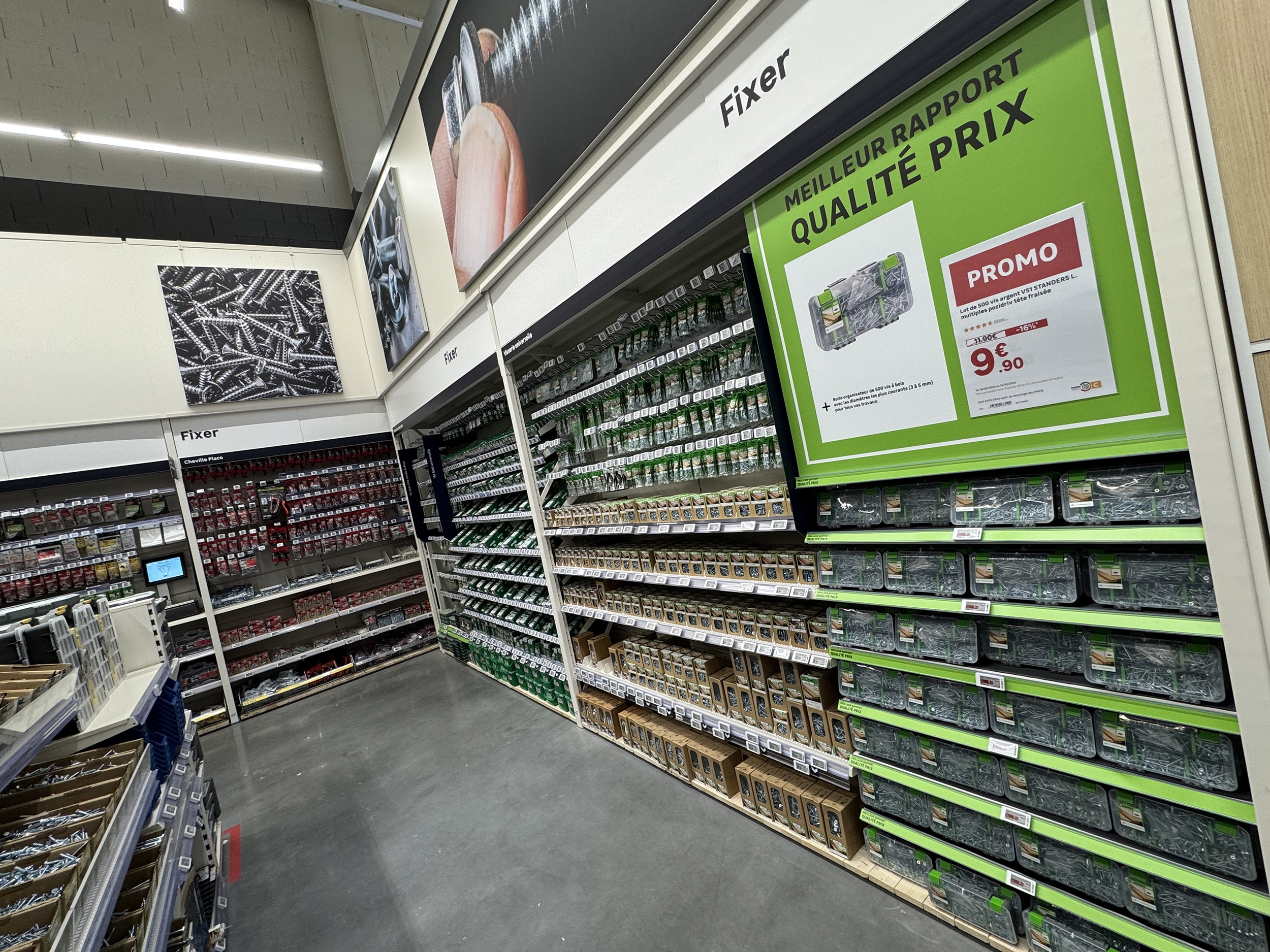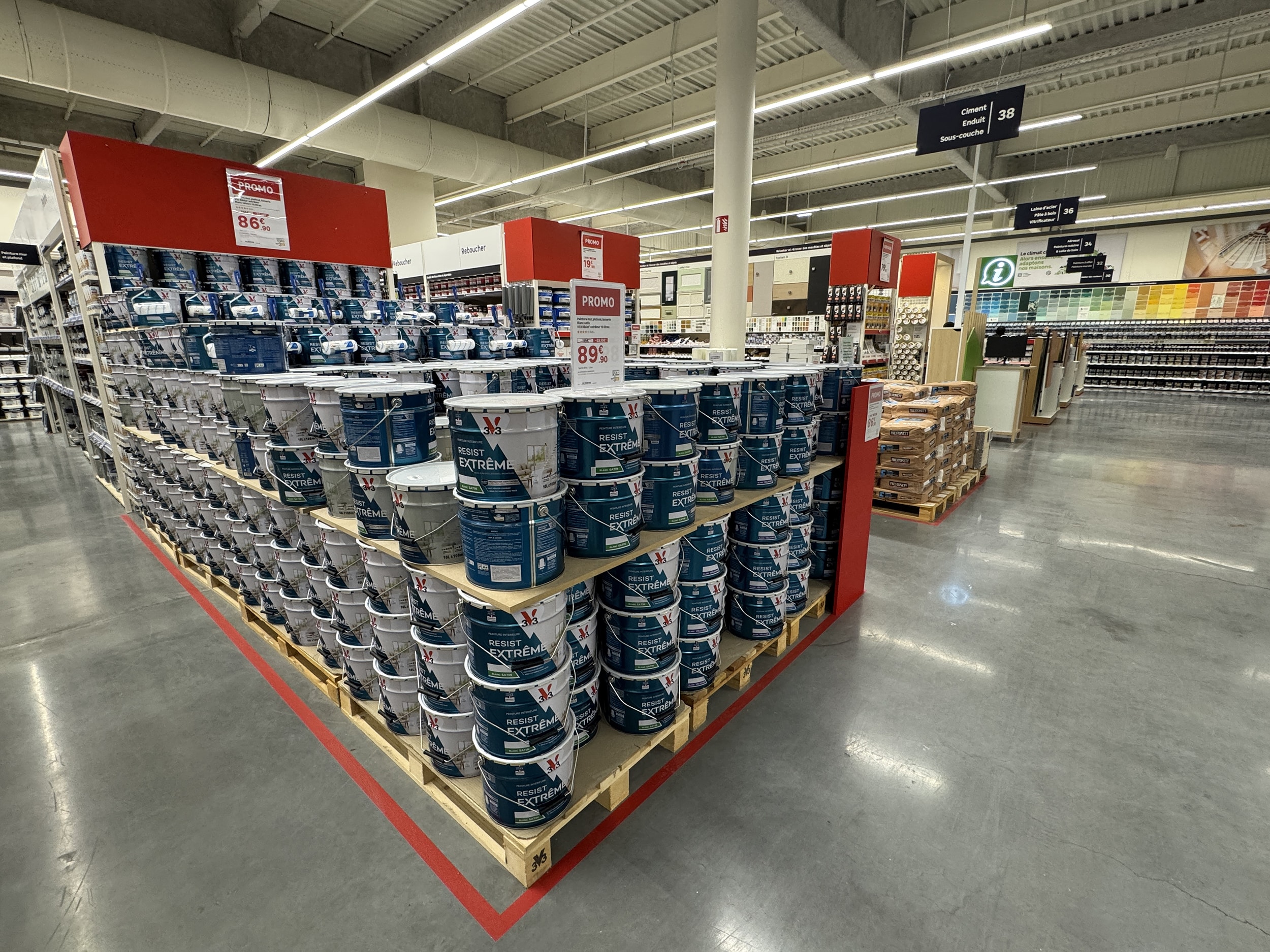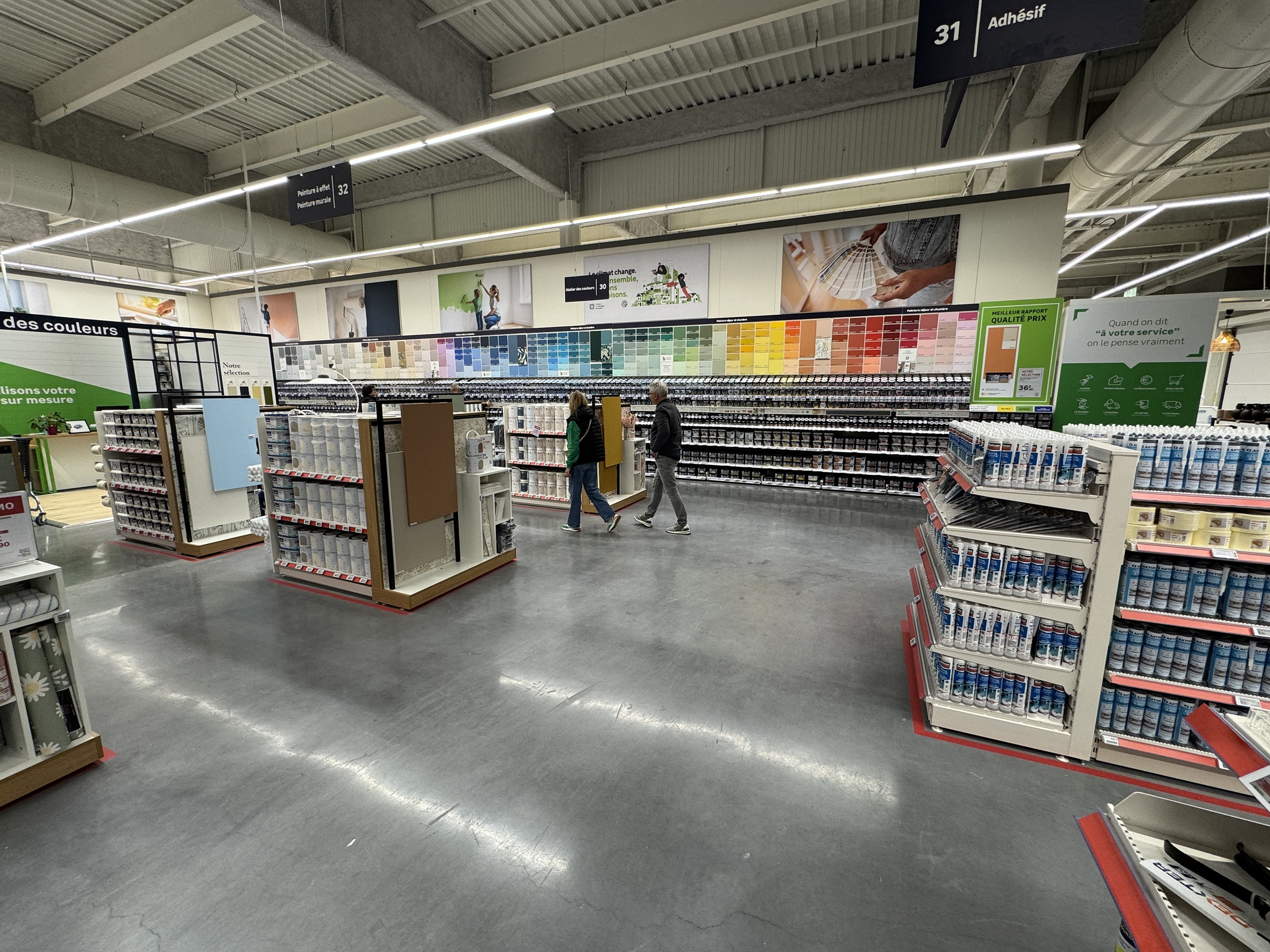 Leroy Merlin a donc pris une décision courageuse : réduire l’offre. Comparée à l’ancienne coque (de l’autre côté de la rue), la nouvelle mouture a donc gagné en surface (+ 1 000 m2) mais perdu plus de 6 000 réfs : de 46 K à moins de 40 K. C’est courageux mais réaliste, car jamais un point de vente physique ne pourra de toute façon rivaliser avec un site de e-commerce avec (au minimum) des centaines de milliers d’offres. Alors, Leroy Merlin a taillé… En peinture par exemple, exit les coloris qui sortaient moins d’une fois par mois. L’offre est passée de plus de 900 réfs à 700. Mais une infinité de couleurs est toujours disponible via la machine à teinter.