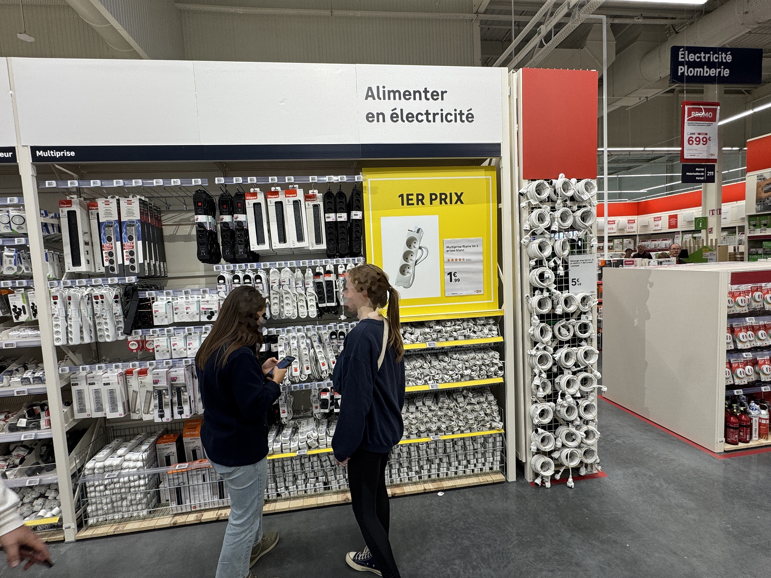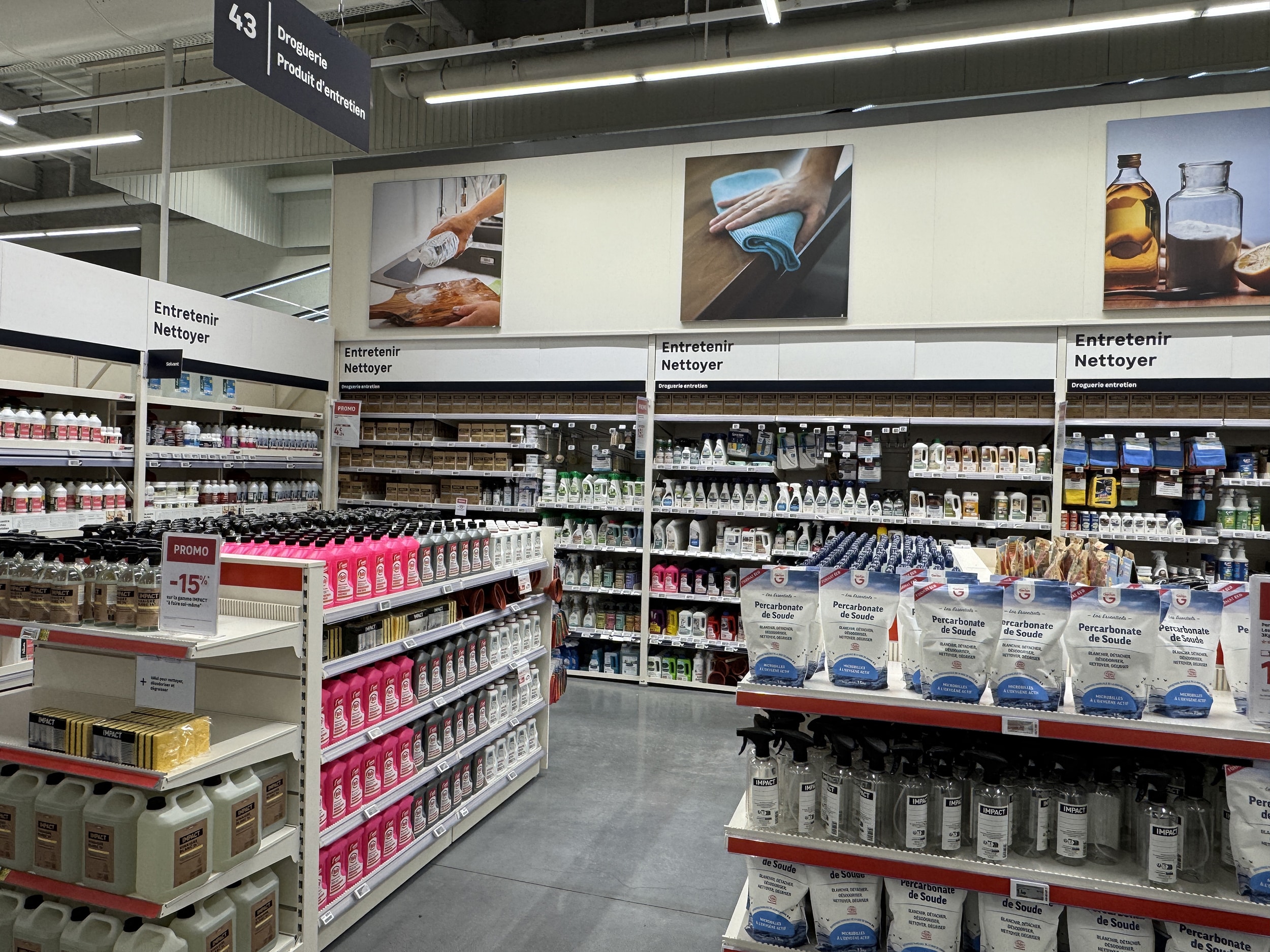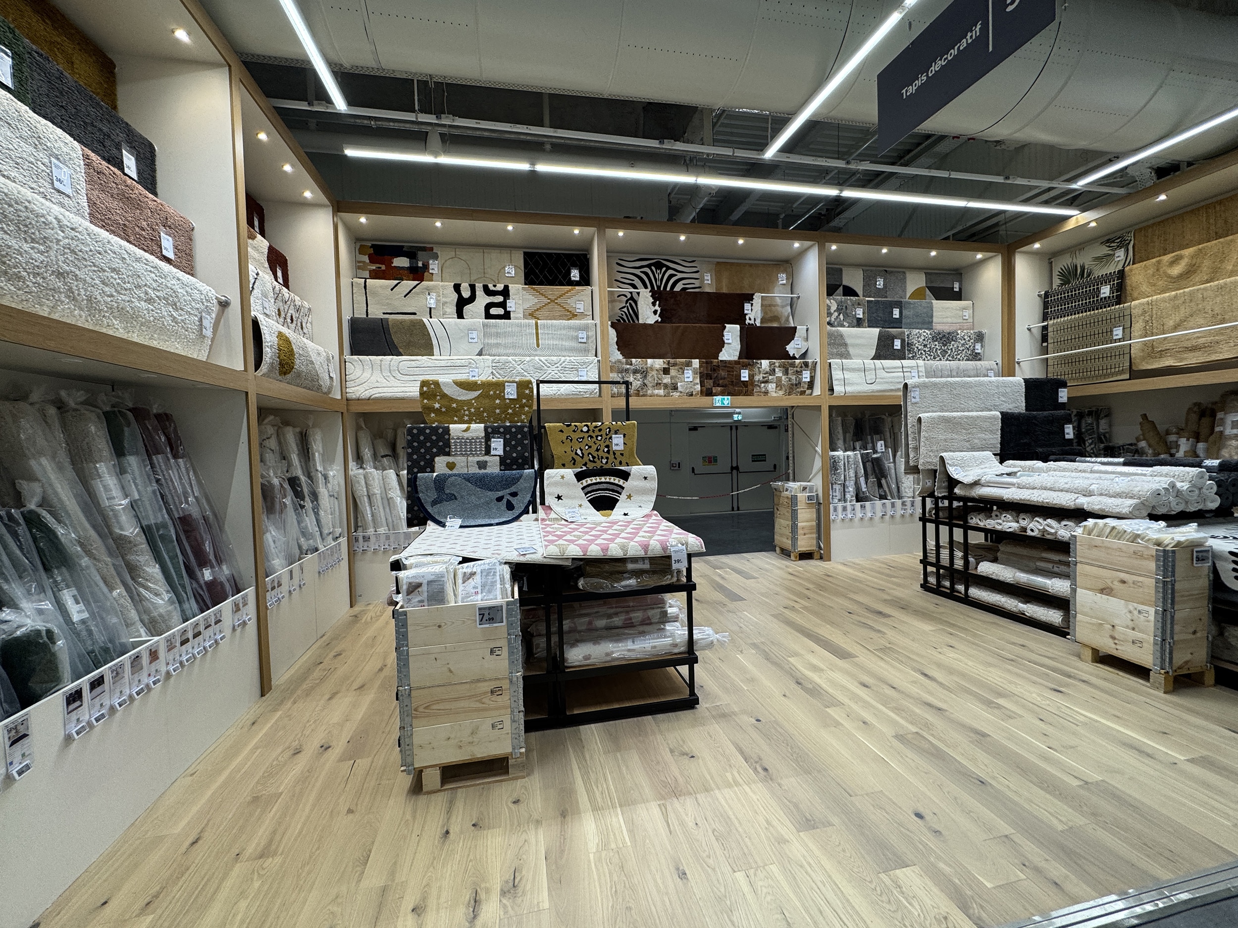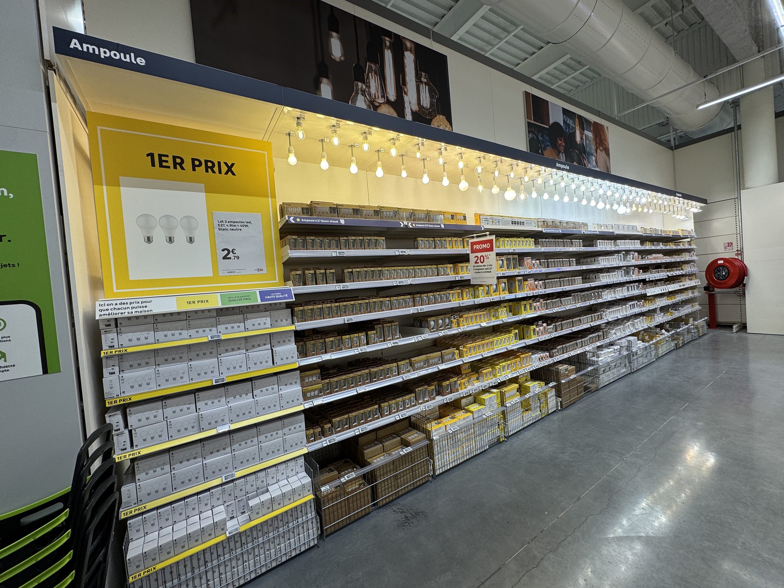 L’intérêt de réduire l’assortiment (quand il est pléthorique et pour partie “dormant”), c’est qu’en conséquence ça permet 2 choses majeures pour redonner une mission au magasin… D’abord, disposer du stock, ce qui est le cas ici pour éviter que le magasin ne soit qu’un showroom, et donc permettre au client de repartir avec la marchandise, ce qu’aucun site web ne permettra ! Second intérêt, offrir des possibilités merchandising inédites que j’ai retrouvées ici à Villeneuve d’Ascq : massifier (en version XXL) lorsque l’offre le justifie, exposer l’offre de manière plus lisible que d’ordinaire (parce qu’il y a la place de la “montrer” / la base…), réduire la hauteur des gondoles pour cultiver la notion d’univers d’usage, sur-linéariser certaines offres pour gagner en impact (comme les premiers prix et les MDD), etc. Bref, faire ce que le web ne peut pas faire. Voilà pourquoi je défends ce magasin (au-delà de ses défauts par ailleurs) : parce que c’est tout simplement un “vrai” magasin !