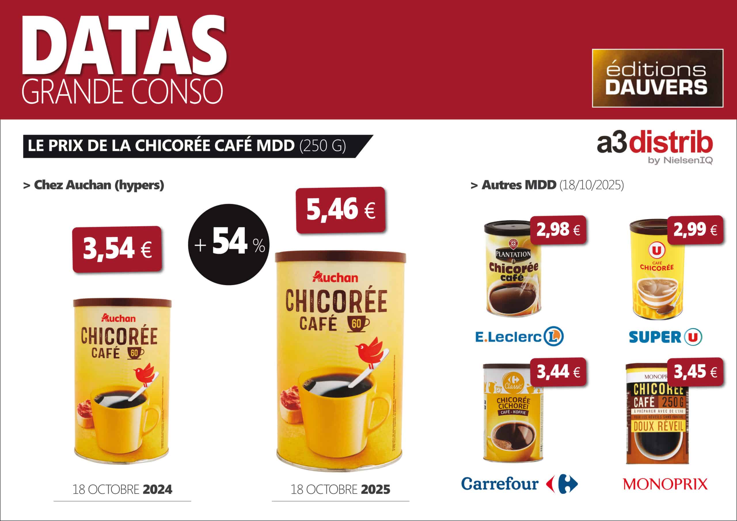 Dimanche infographie, suite ! Et à présent la démonstration que l’image-prix, c’est (aussi) du détail. Imaginez le client Auchan (hyper), adepte de chicorée MDD. Après tout, pourquoi pas… En un an, il a vu le prix de son pot de 250 g augmenter inconsidérément. De 3,54 € à 5,46 €, soit plus de 50 % d’inflation. Curieux, il va… “voir ailleurs” ! Et, là, il découvre que même Monoprix est nettement moins cher. Il en déduit quoi d’après vous ?