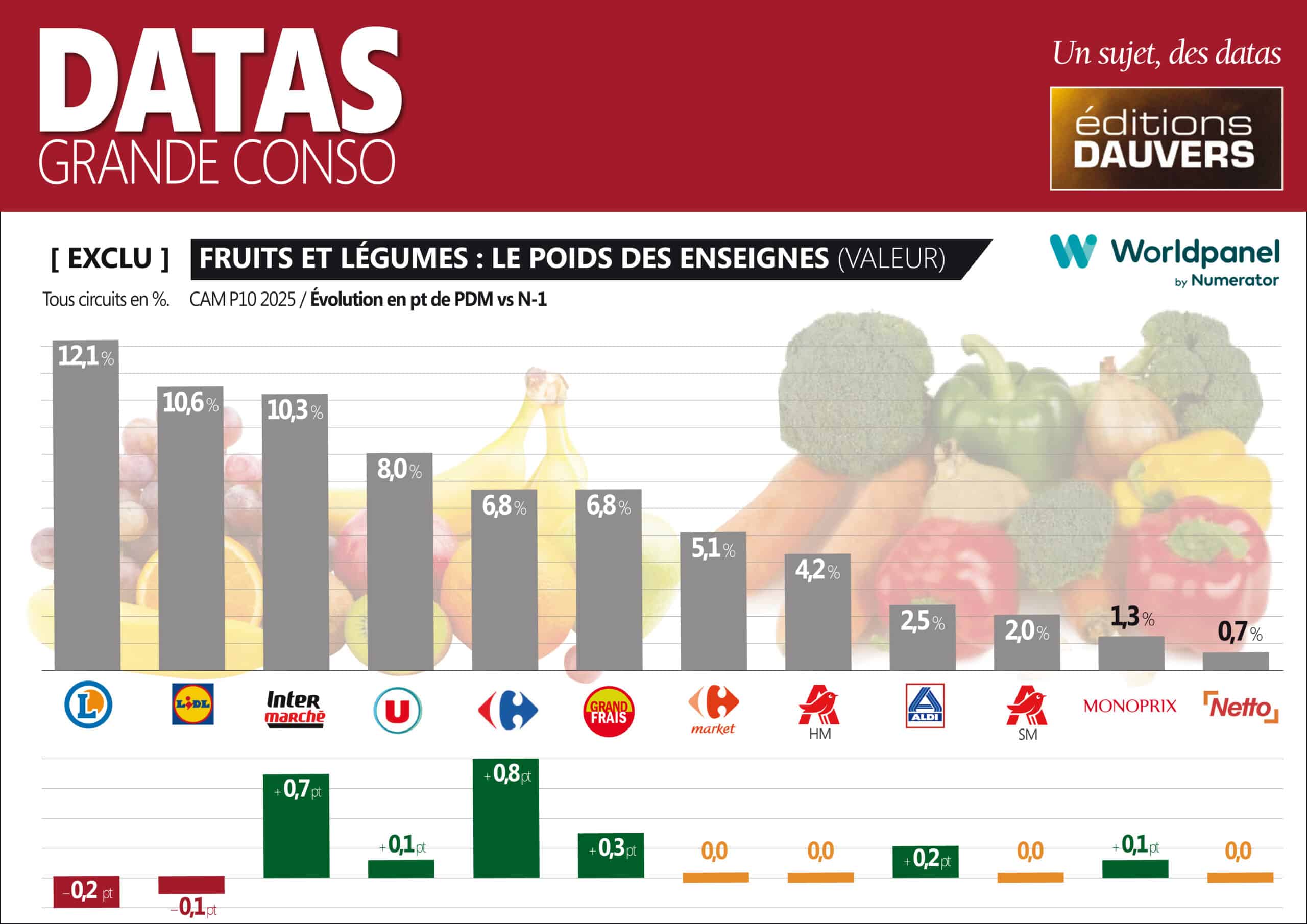 La montée en puissance Grand Frais se poursuit ! Année après année, l’enseigne spécialisée produits frais trad grappille des parts de marché selon les calculs de Worldpanel (ex-Kantar). Et notamment sur les fruits et légumes, son cœur de marché. Grand Frais distance désormais nettement Auchan France (les hypers et les supers) et fait jeu égal avec les hypers Carrefour, lesquels profitent cette année de l’acquisition de Cora. Mais, au rythme actuel, il est probable que Grand Frais sera devant l’an prochain. Car l’enseigne profite de l’ouverture de nouveaux points de vente et donc, par ricochet, d’un accroissement de sa clientèle. Sur les dernières années, Grand Frais s’arroge ainsi un point de pénétration annuel. A date, près d’un Français sur quatre est client (23,3 %).