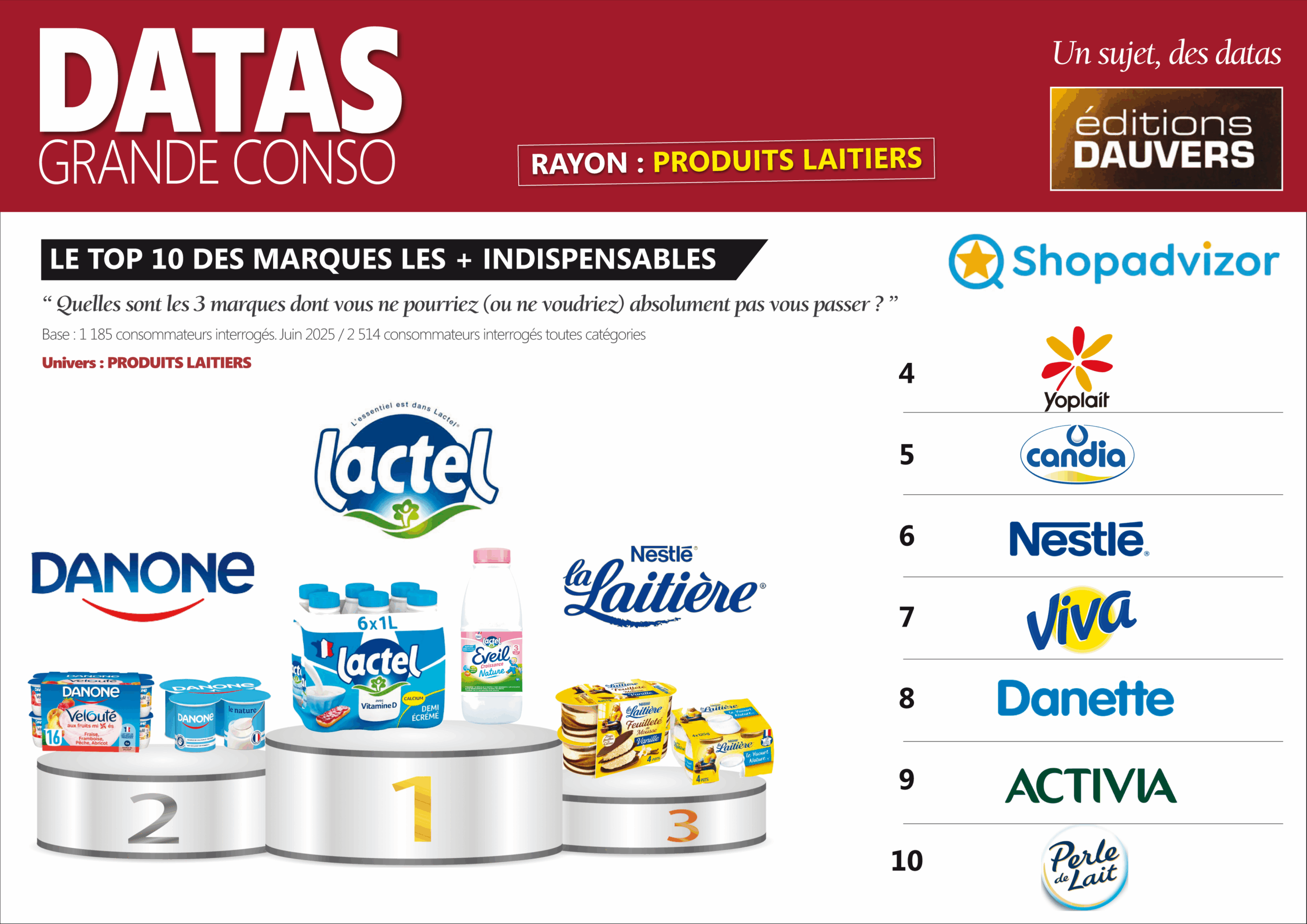 Après la révélation des 10 marques les plus indispensables toutes catégories confondues (revoir ici), je poursuis le détail par rayons. Aujourd’hui : les produits laitiers. Et un classement trusté par les trois mastodontes du lait : Lactalis (pour Lactel et l’association avec les marques de Nestlé), Danone (avec aussi Danette et Activia) et la coopérative Sodiaal (la plus représentée avec 4 marques : Yoplait, Candia, Viva et Perle de Lait).
