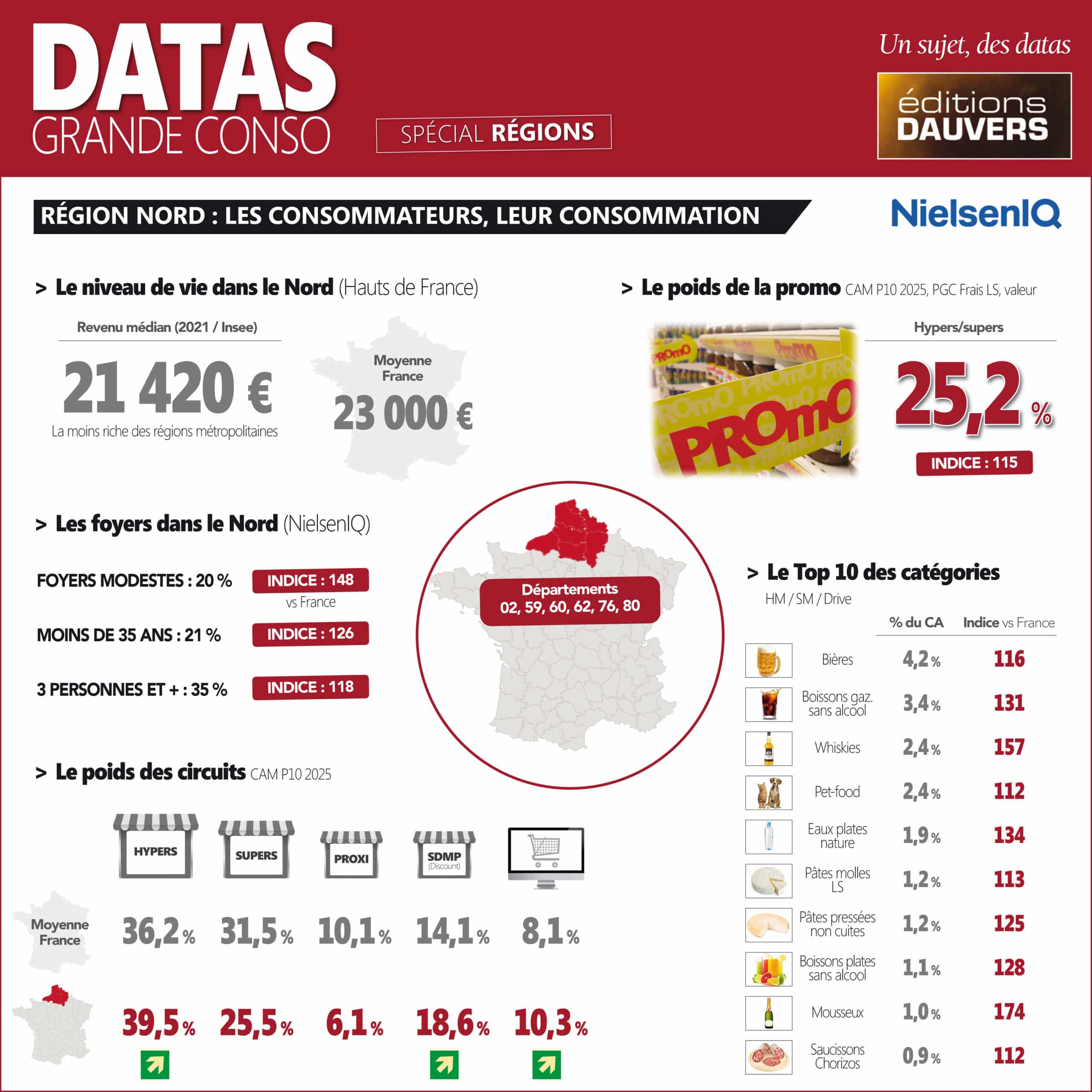 Le Retail Inspiration Tour, co-organisé avec Vusion, fait aujourd’hui escale à Lille. L’occasion d’une étude NielsenIQ “Ici, c’est le Nord” sur les spécificités de conso régionales. Comme toujours, c’est l’illustration que la conso est bien l’expression de la société. Le Nord est ainsi une région dont le niveau de vie est en-deça de la moyenne nationale (je ne porte pas de jugement de valeur, hein !). Ce qui se traduit à plein d’égards. Dans les circuits fréquentés déjà : le discount est clairement en sur-performance (18,6 % des dépenses, soit + 4 pts vs la moyenne nationale) et la proxi très en dessous, parce que plus chère. Dans les produits aussi : les “mousseux” (comprendre les effervescents hors champagne) pointent dans le Top 10 des catégories avec un indice de sur-consommation de 174 ! Autres corrélations entre socio-démo et conso : la relative jeunesse (indice 126 pour les moins de 35 ans), sans doute à relier avec le niveau de consommation de boissons gazeuses sans alcool ; ou encore la taille des foyers (indice 118 pour les 3 personnes et +) qui rend les clients plus perméables à la promo (et ses volumes XXL). Bref, ici, c’est le Nord !