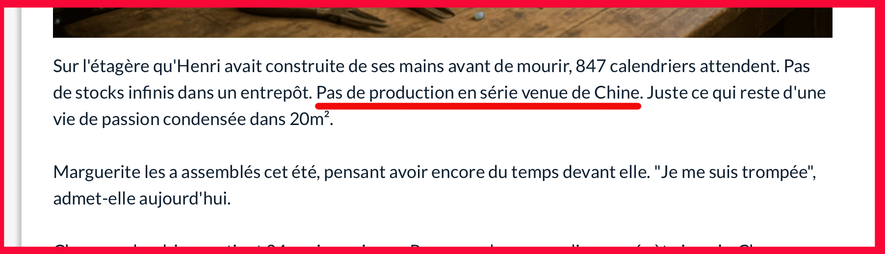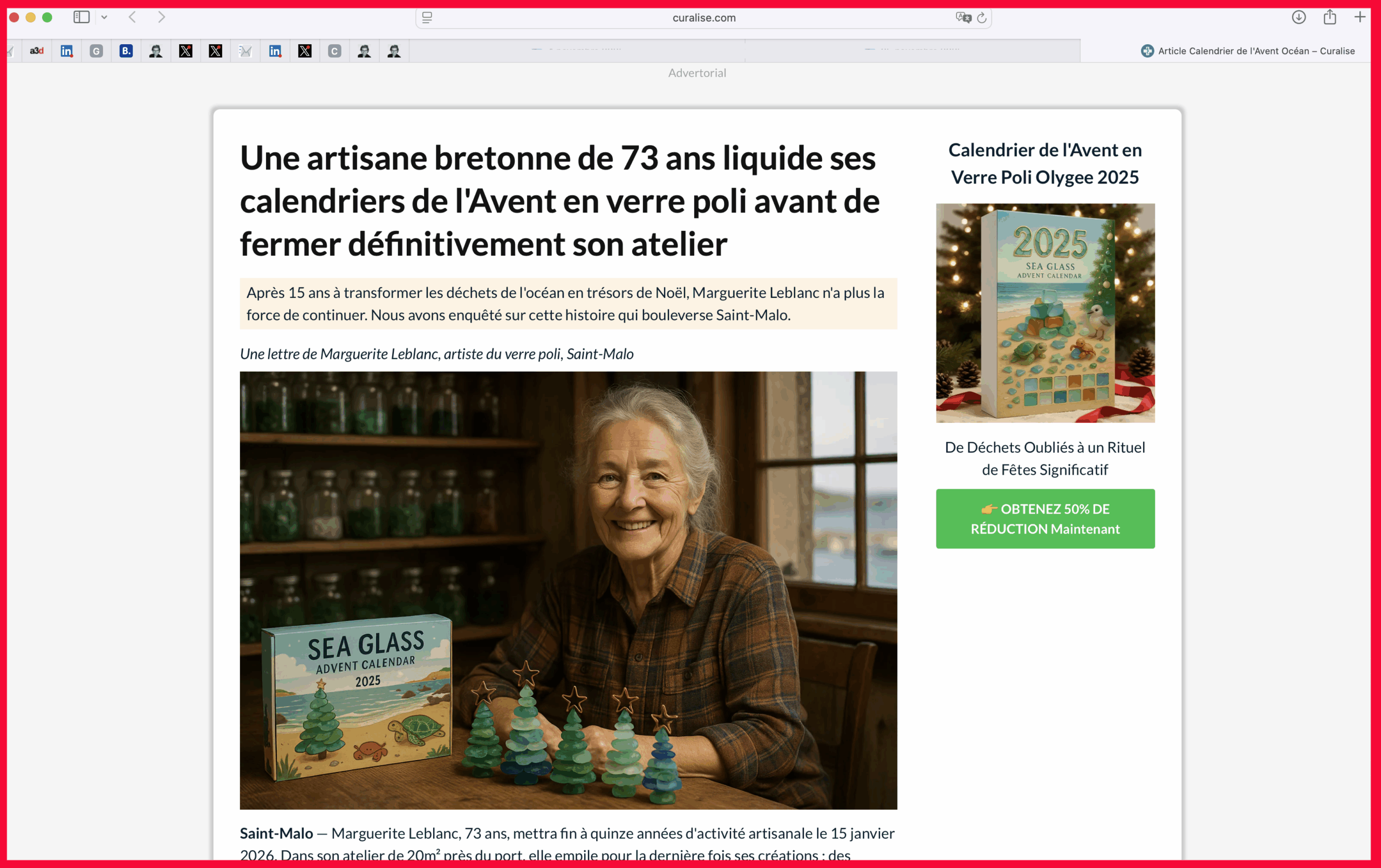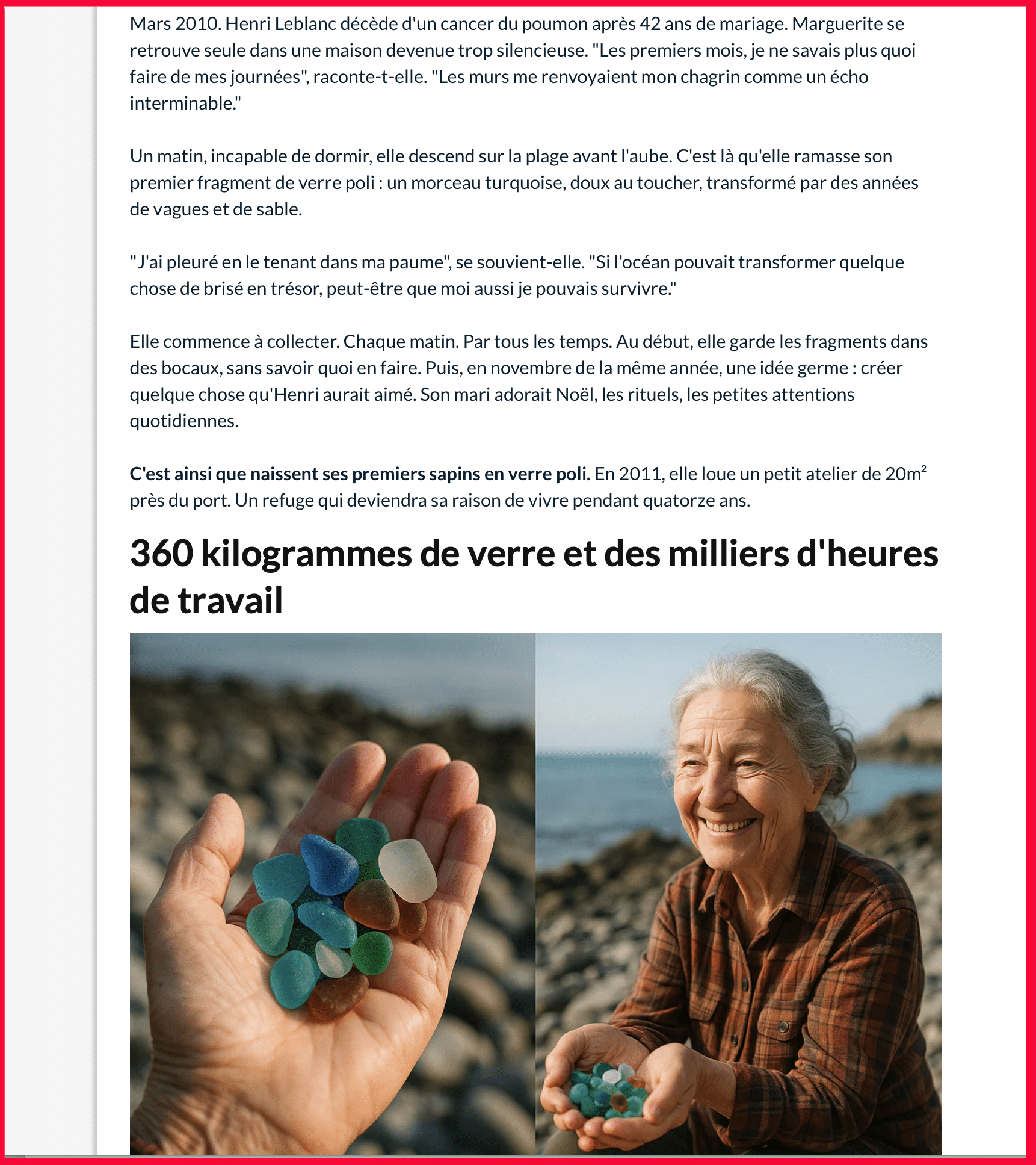 Aujourd’hui, bienvenue chez Curalise.com qui, en la matière, bat des records ! D’abord l’image version IA. Marguerite Leblanc, la créatrice des objets mis en vente sous forme de calendrier de l’avent : tout droit sortie d’un générateur d’image. Ensuite, le story-telling “plus c’est gros, plus ça passe”. Donc Marguerite Leblanc à Saint-Malo. Veuve depuis 2010 d’Henri Leblanc, emporté d’un cancer du poumon. “Un matin, incapable de dormir, peut-on lire, elle descend sur la plage avant l’aube. C’est là qu’elle ramasse son premier fragment de verre poli : un morceau turquoise, doux au toucher, transformé par des années de vagues et de sable“. J’vous passe les détails, mais, un jour, voulant rendre hommage à son défunt marin, elle assemble les morceaux de verre poli pour en faire des sapins. Pendant 15 ans.