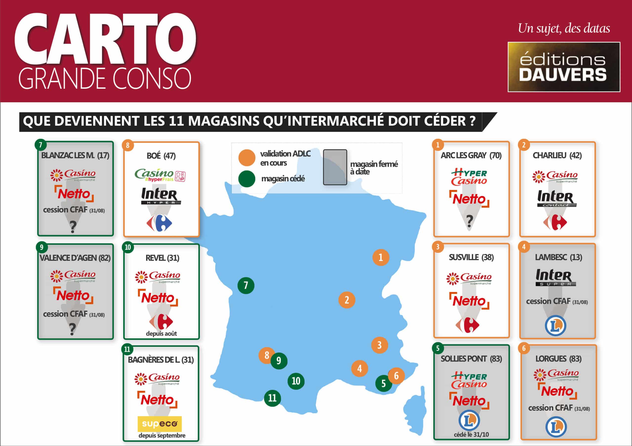 Jusque-là, rien que du très classique, si je puis dire. La suite est plus rocambolesque. Cet été, Auchan était annoncé sur 4 sites : Blanzac (17), Valence d’Agen (82), Lambesc (13) et Lorgues (83). À la manœuvre, non pas Auchan en direct, mais un duo de candidats à la franchise, Cédric Ayache et son frère, via leur coquille juridique CFAF. Apportant des garanties financières et l’expérience requise en GSA (franchise G20), le dossier est validé par l’ADLC fin août. À peine achetés, les 4 magasins ont fermé et le néo-franchisé est aux abonnés absents depuis. Autant dire qu’il est permis de douter de ses intentions initiales. D’autant qu’il vient de recéder deux des quatre fonds… à des adhérents Leclerc : Lorgues à Loïc Faraco et Lambesc à Rémy Rey (directeur postulant). Quid des deux autres magasins, Blanzac et Valence d’Agen ? Une chose est sûre, l’hypothèse Auchan n’a plus cours. Si l’ADLC n’a que très moyennement goûté la manœuvre, elle devrait valider les projets de Leclerc (soumis à son approbation) au nom de la concurrence. Sans préjuger des suites à donner…