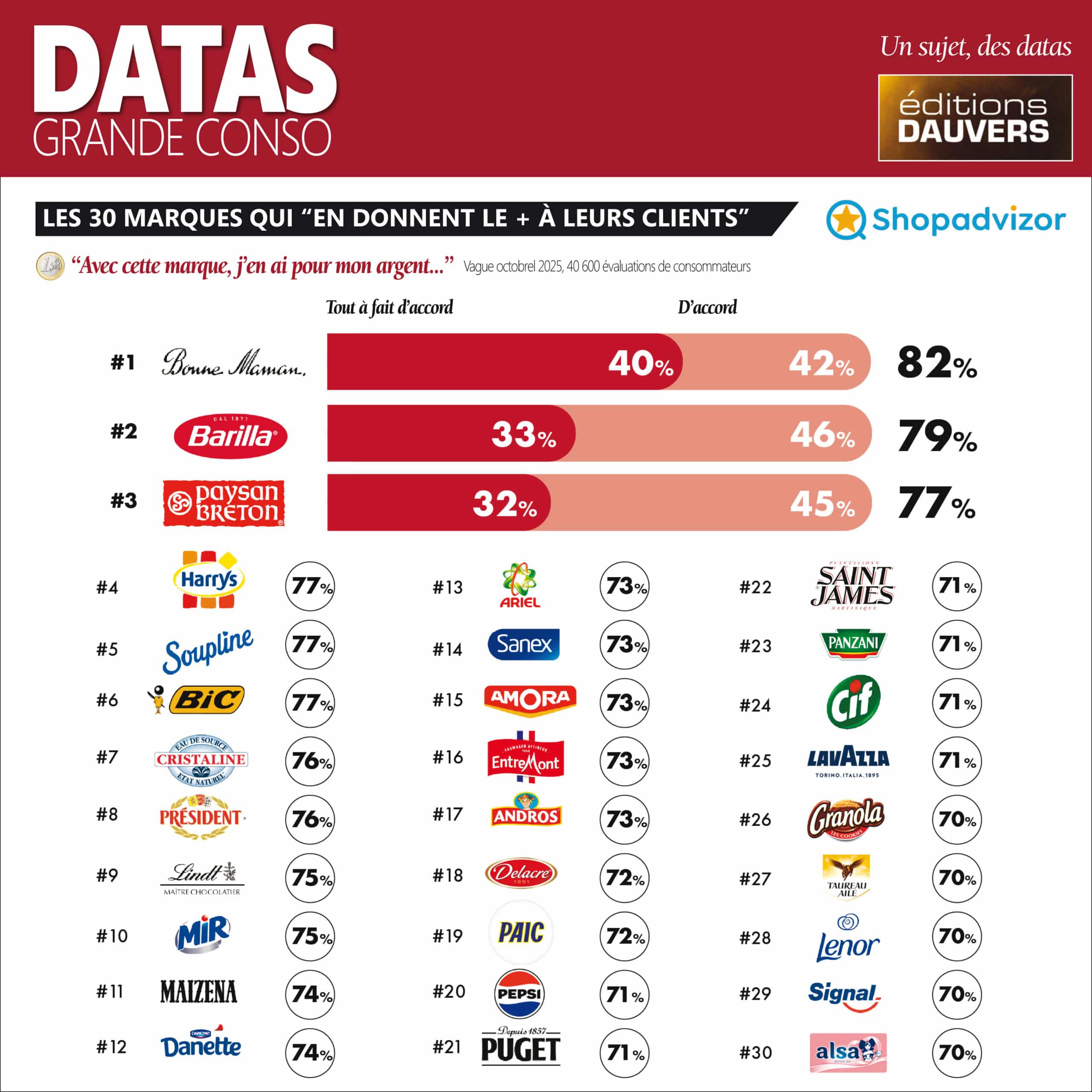 Shopadvizor a testé 309 marques de grande conso (via 40 600 évaluations). Et pour la première depuis l’origine de l’étude, Cristaline ne s’impose pas ! En tant que tel, c’est un événement… La marque demeure tout de même dans le Top 10 (sur 309, c’est respectable) mais est donc chassée de son piédestal par Bonne Maman. Au passage, le trophée quitte une marque économique (très en-deça du prix moyen de sa catégorie) pour une marque premium (au-dessus du prix moyen de ses catégories, surtout en biscuits et ultra-frais). Preuve que la valeur perçue n’est pas uniquement une affaire de prix, mais bien un équilibre entre ce que le client donne et ce qu’il reçoit.