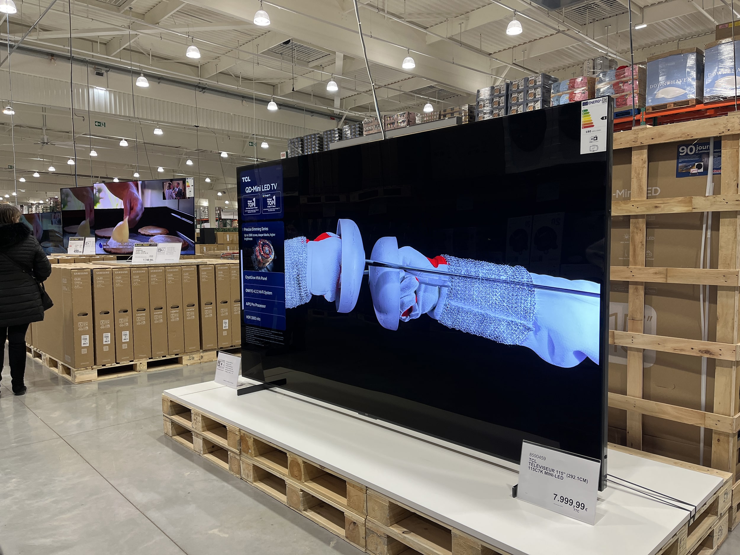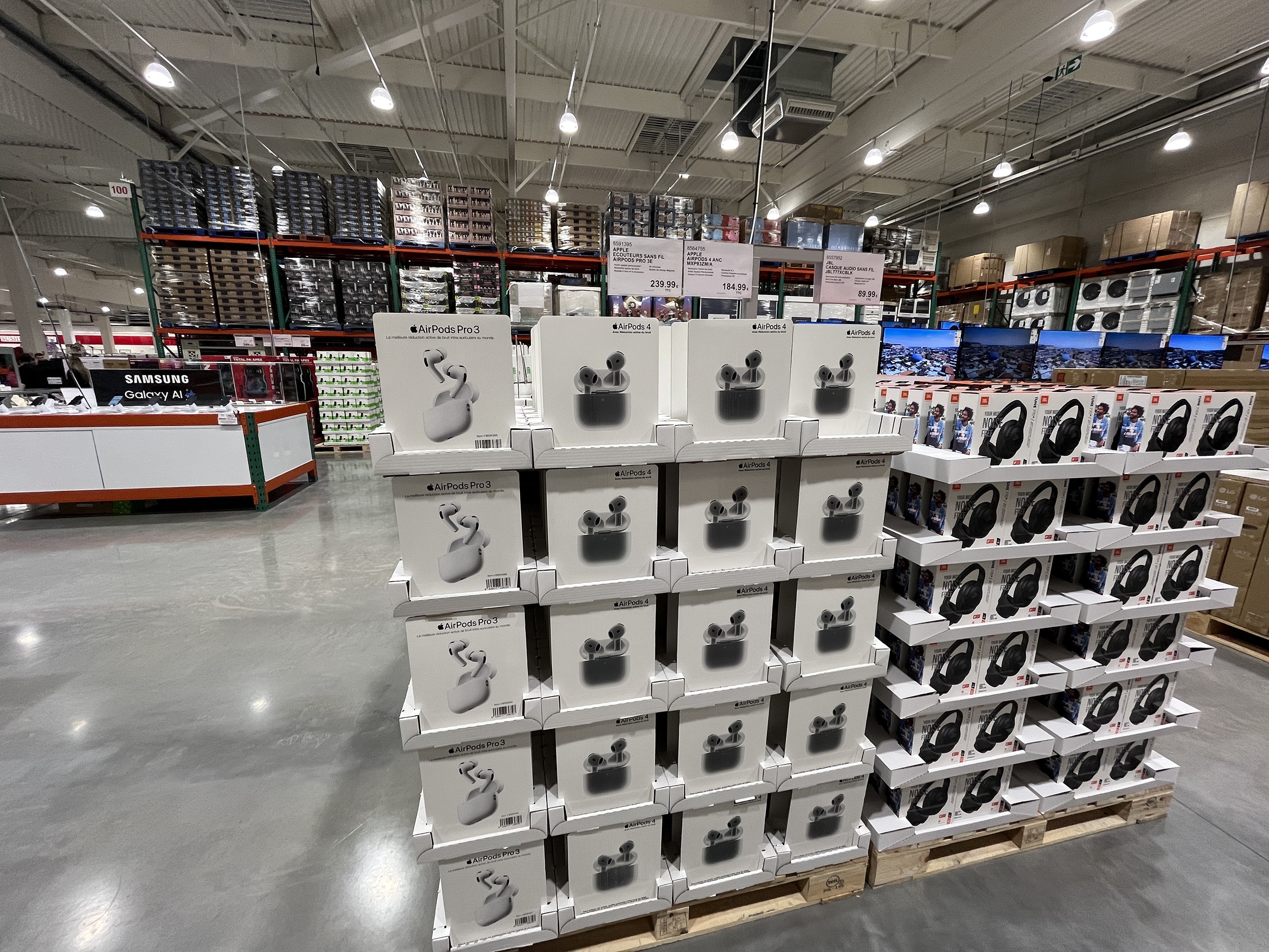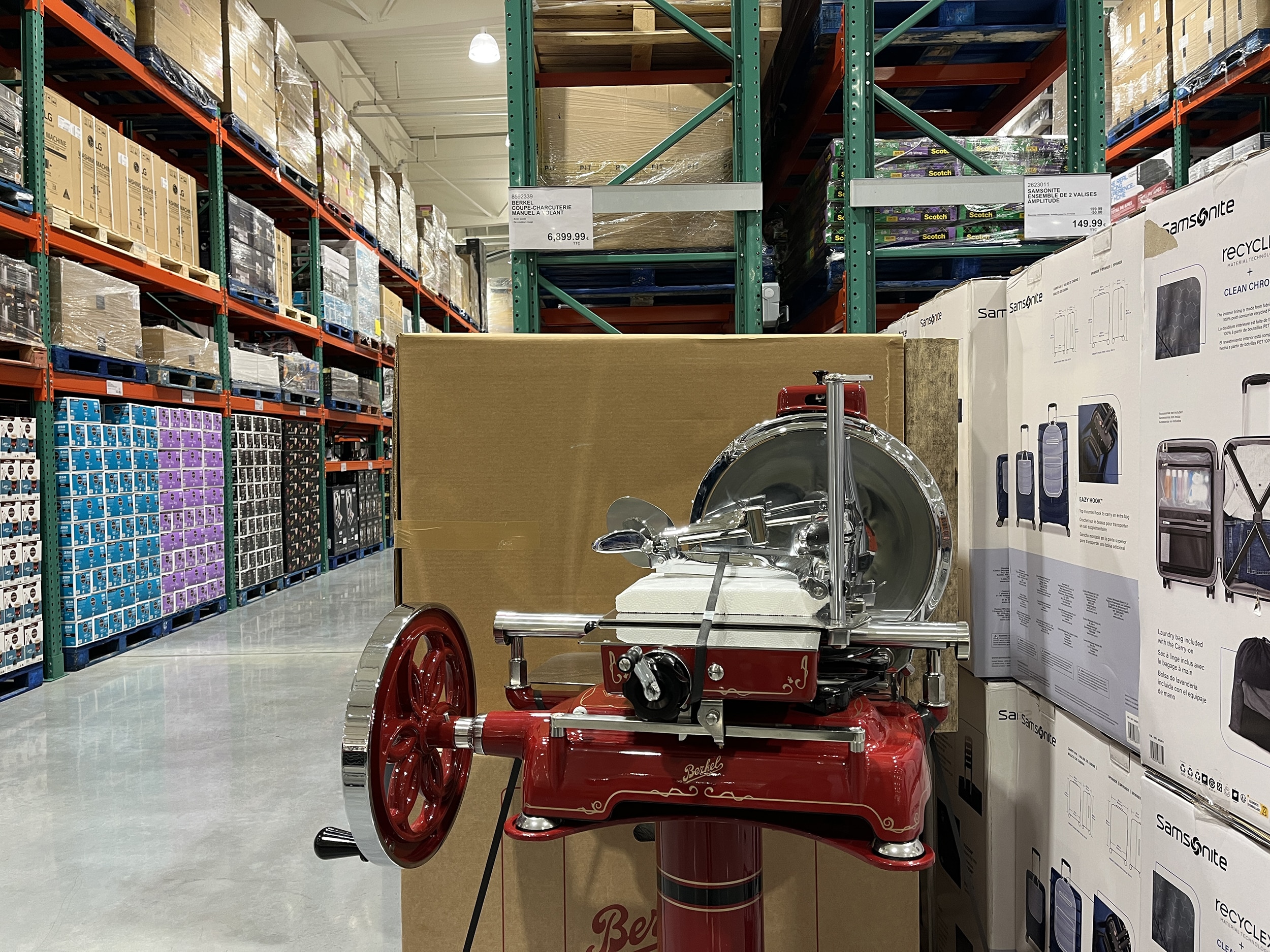 L’ouverture d’un Costco est toujours une gourmandise pour tout amateur de commerce. Car, avec Costco, l’effet waouh est garanti. Pour planter le décor, c’est un écran plat 115 pouces à 8 000 € qui accueillait les clients ce matin, face à l’entrée. Mais il y avait aussi une machine à jambon Berkel à 6 400 euros (pour les connaisseurs) ou les traditionnels bijoux à plusieurs milliers d’euros, à proximité des jeans Levis à 29,99 € et des AirPods 4 (184,99 €), vendus sur palette. La « foire à tout » à la Costco.