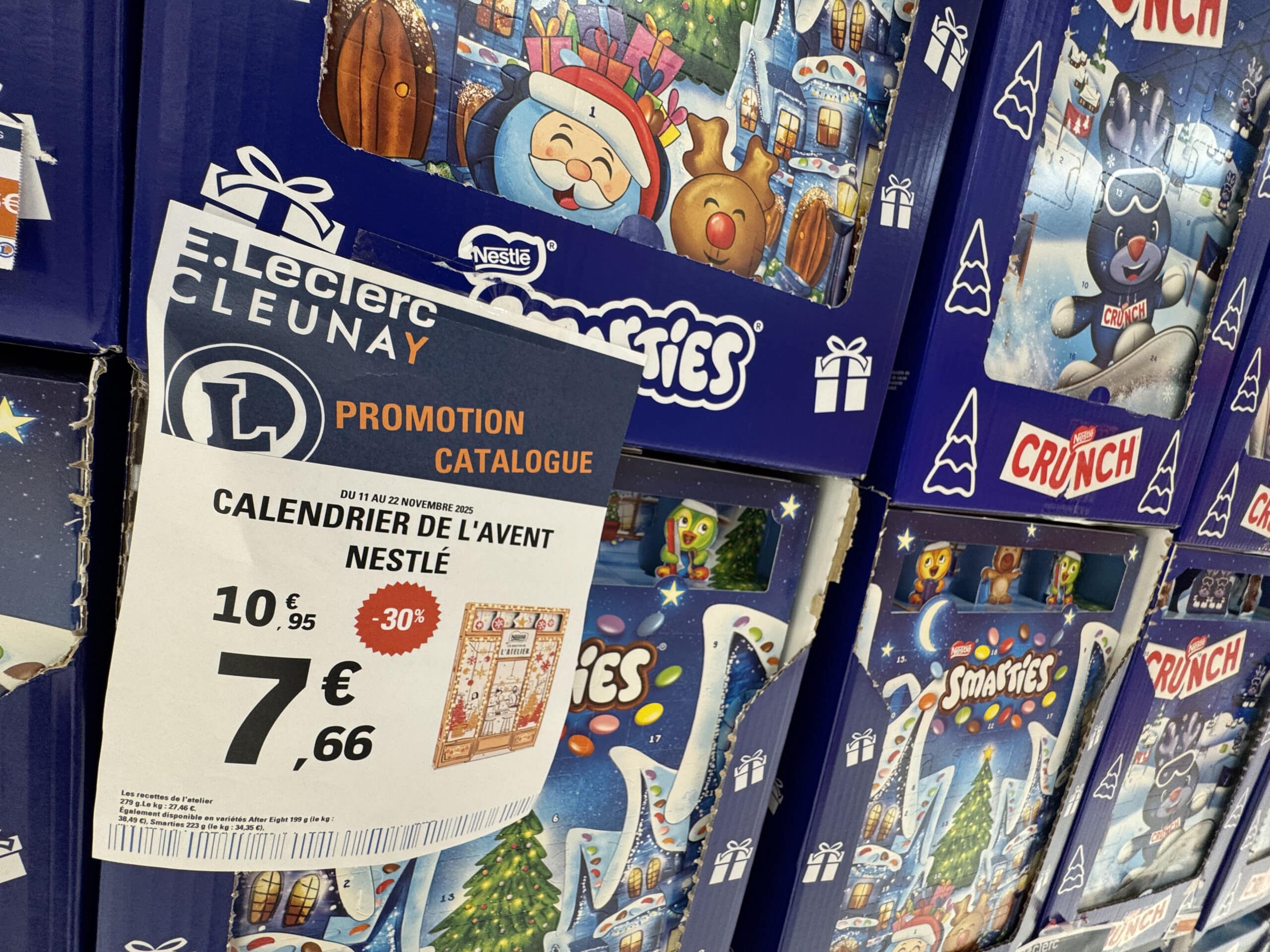 Je sais, je suis un brin familier ! Alors qu’on est dimanche, jour du Seigneur, repentance, confession et tout le toutim… Mais je maintiens et j’appuie même : je dois VRAIMENT être trop “con” pour comprendre la signification d’un prix avant remise pour un produit aussi saisonnier qu’un calendrier de l’Avent. Ici par exemple : à quoi correspond donc le 10,95 € qui justifie ensuite d’une remise de 30 % pour atterrir à 7,66 €, puisque le produit n’était pas en rayon avant la saison et n’a donc aucun prix de référence ? Dans ce cas, je trouve Nestlé et Leclerc bien peu ambitieux.. Pourquoi ne pas fixer un prix théorique à 769 € remisé de 99 % pour atteindre 7,66 €. Hein, pourquoi ? Parce que dépasser 34 % de remise est interdit par la loi ? Mais se fiche aussi ouvertement de son client est également interdit (par le bon sens).