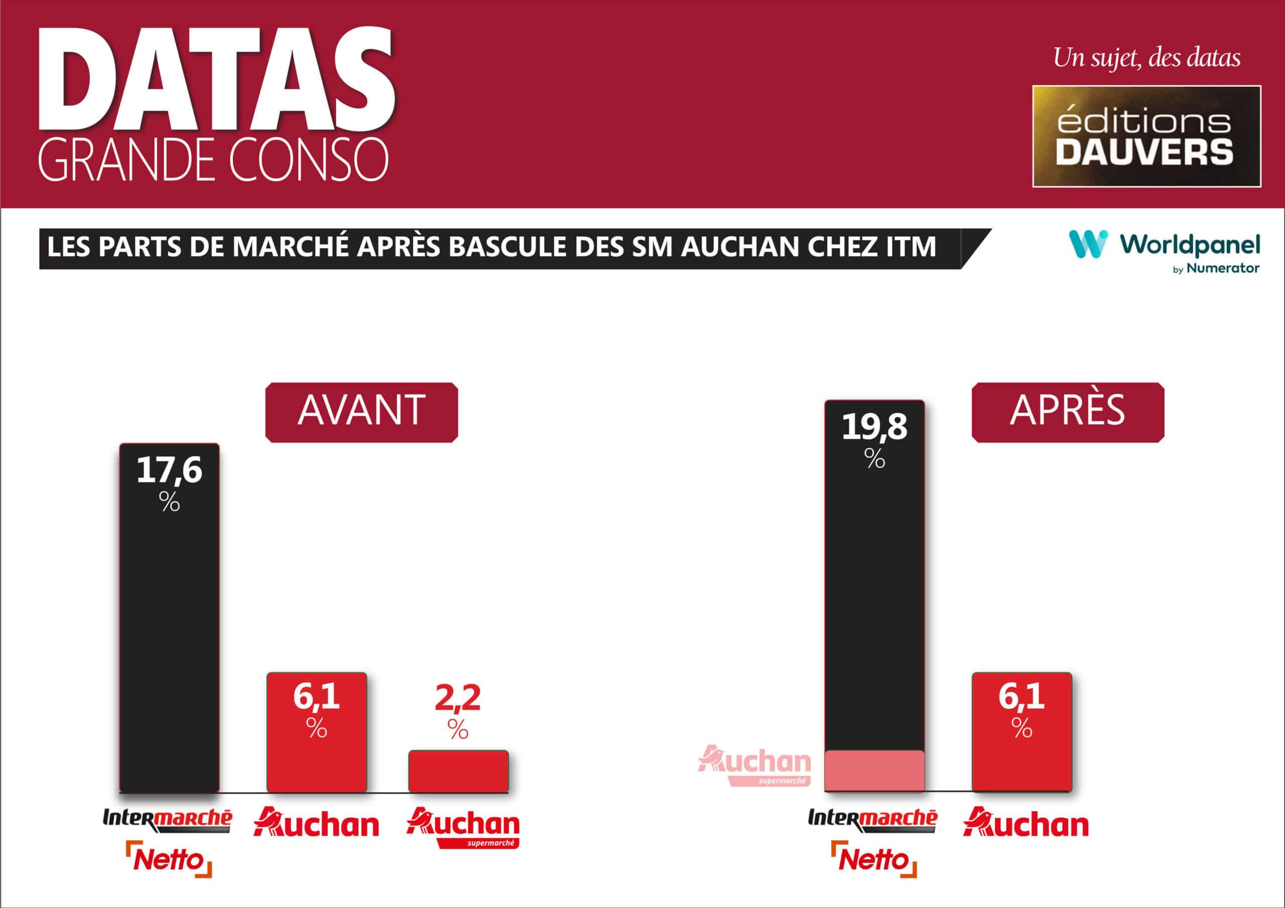 Si le projet est bien validé en l’état, il aboutira à un schéma très inédit dans la distribution alimentaire : d’ici un an, Auchan sera franchisé d’ITM (un statut nouveau chez les Mousquetaires) et exploitera donc ses deux formats principaux sous deux enseignes concurrentes : Auchan en HM, Intermarché/Netto en SM.
