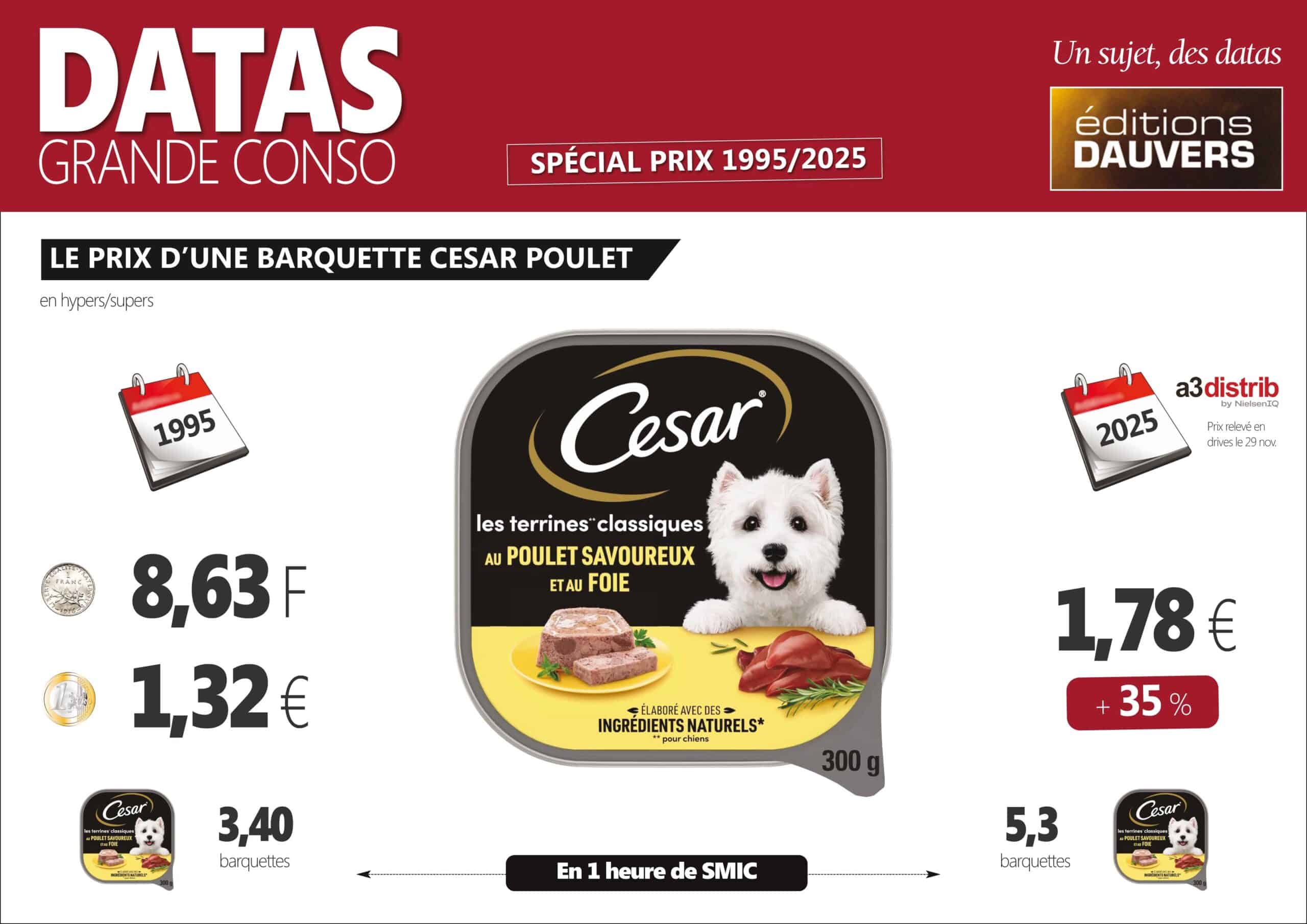 Nouvel épisode de ma série dominicale “Retour dans le passé des prix”. Episode 21 : la barquette de Cesar poulet. Sur 30 ans : 35 % d’inflation, dont une part importante sur la période récente d’envolée de l’énergie. Et pourtant… Rapportée à l’évolution du Smic sur la période, le prix de la barquette a en fait… baissé. En 1995, une heure de travail permettait de s’offrir 3,4 barquettes. C’est désormais presque 2 barquettes de plus !