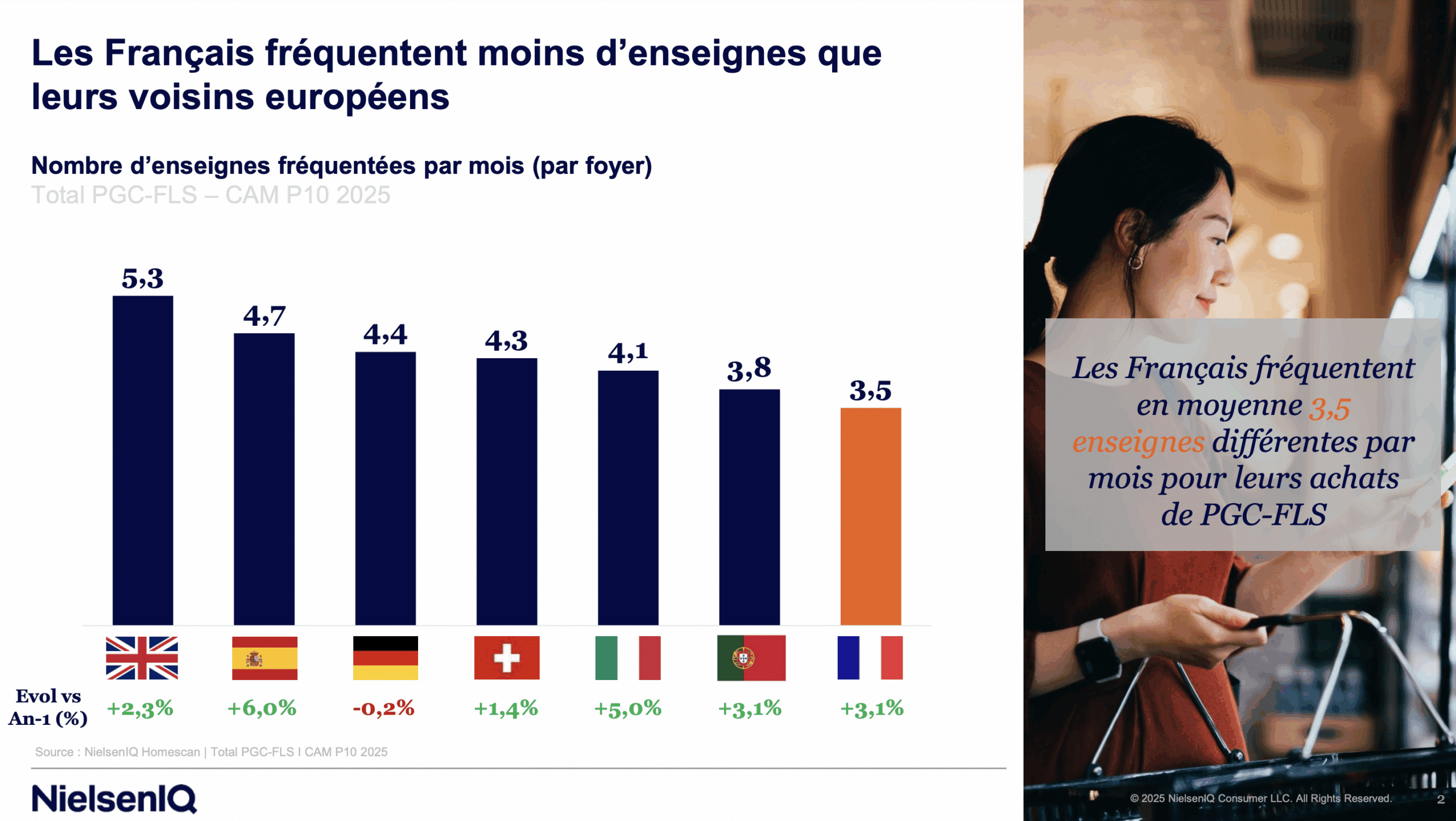 Passionnante étude publiée ce matin par NielsenIQ sur les différences dans les comportements de consommation entre pays d’Europe. Et… une surprise ! Les Français sont donc les consommateurs européens les plus fidèles. Seulement 3,5 enseignes fréquentées par mois en moyenne. C’est donc moins que partout ailleurs. La fidélité, une vertu française…