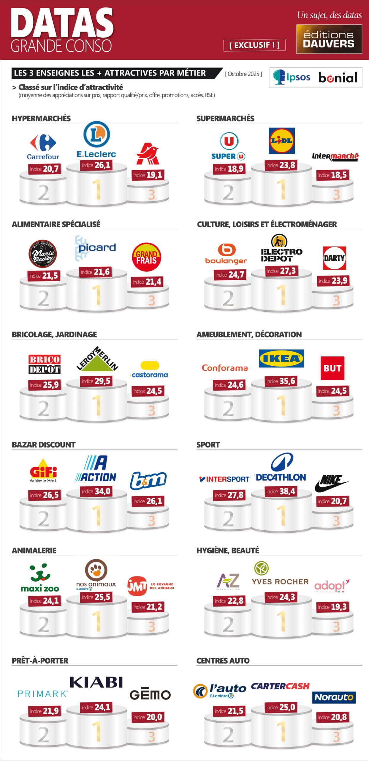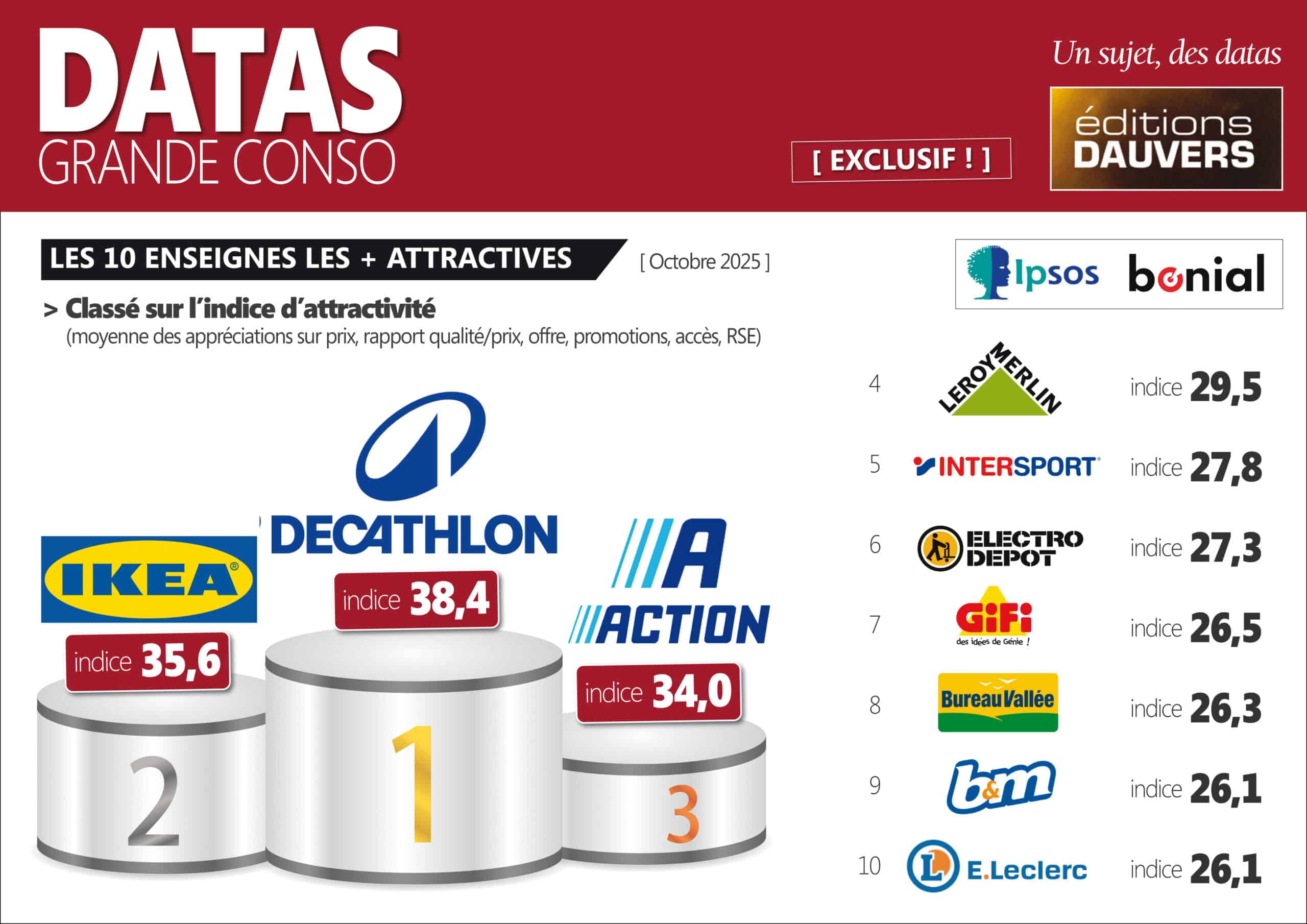 Pour déterminer l’attractivité (et donc en creux la préférence à l’enseigne), 11 items réunis autour autour du prix, de l’offre, du rapport qualité/prix, des promotions ou encore des initiatives RSE). L’ensemble des réponses est agrégé dans un indice composite qui distingue ensuite les enseignes. Le palmarès 2025 est assez proche des résultats de la première vague l’an dernier. Le Top 10 est presque inchangé, à une nuance près : Lidl en sort, ElectroDepot y rentre. De là à imaginer que le limogeage de Michel Biéro, le “M. Lidl” dans les médias, ait eu un effet négatif (au moins pour la visibilité de l’enseigne), il n’y a qu’un pas. Sans doute rapide, mais peut-être pas infondé. La présence sur les plateaux radio/TV (par ce qu’elle permet d’alimenter le narratif d’une enseigne) alimente sans doute l’attractivité.