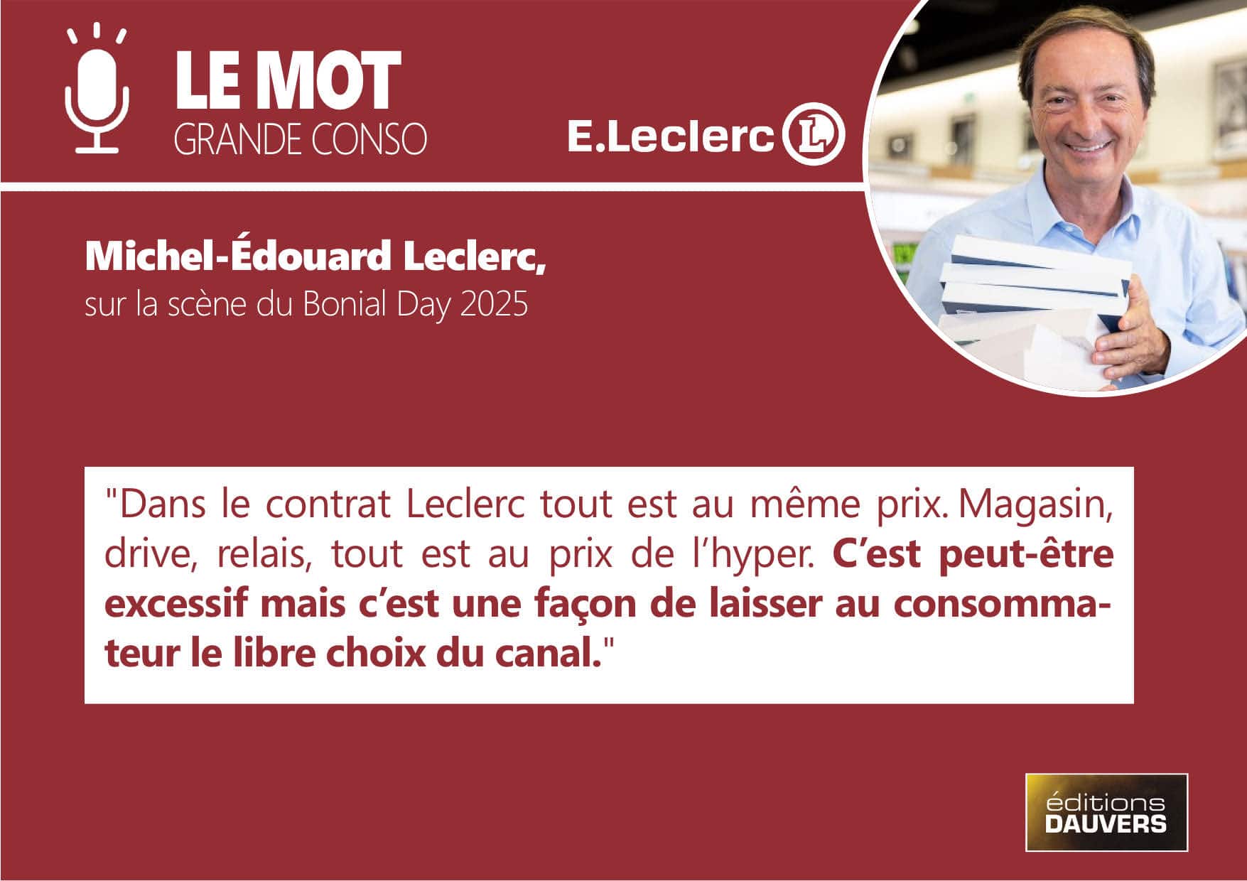 Michel-Édouard Leclerc a parlé longtemps sur la scène du Bonial Day 2025 : de l’histoire du mouvement, des convictions de son père, des Américains et des Chinois qui n’ont pas fini de nous bousculer… En vieux briscard de la distribution, il voulait faire comprendre à l’auditoire qu’il a vu le monde changer, qu’il le voit de nouveau changer aujourd’hui. Et qu’il serait peut-être temps de s’y préparer activement…