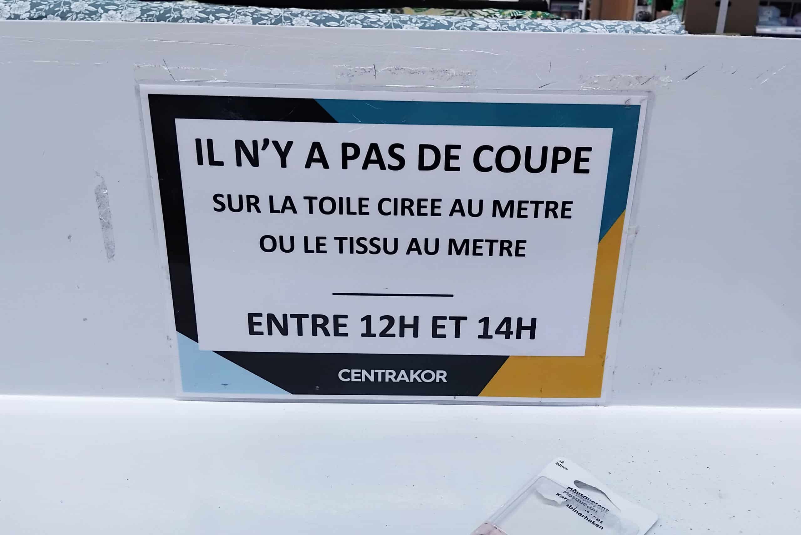 Rayon toile cirée. « Il n’y a pas de coupe sur la toile cirée ou le tissu au mètre entre 12h et 14h ». Parce que c’est la… coupure de midi ?