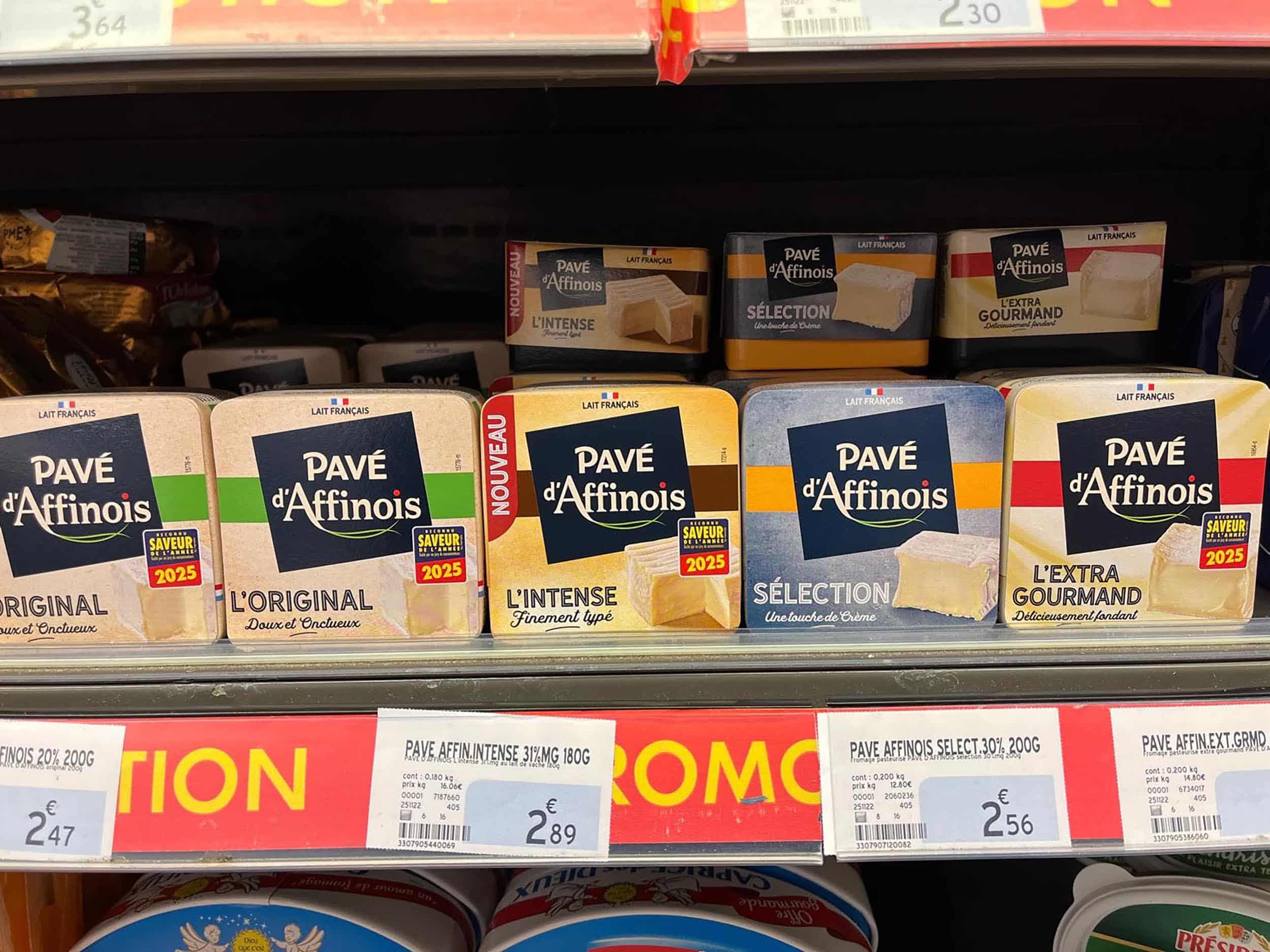 Le Pavé d’Affinois, vous le préférez comment ? Original doux et crémeux ? Intense finement typé ? Sélection avec une touche de crème ? ou Extra Gourmand délicatement fondant ? Dommage, je cherchais le délicatement gourmand et typé. Je repasserai.