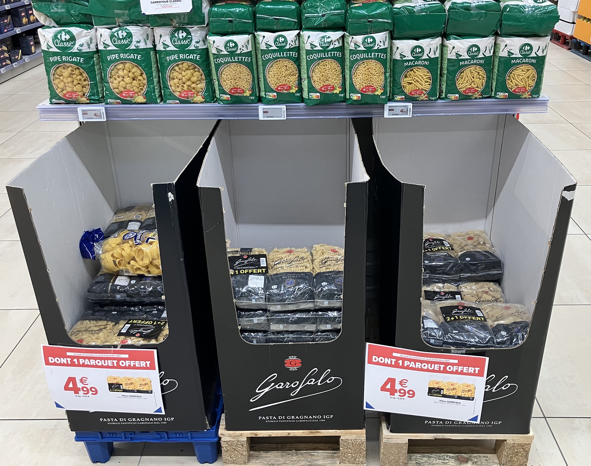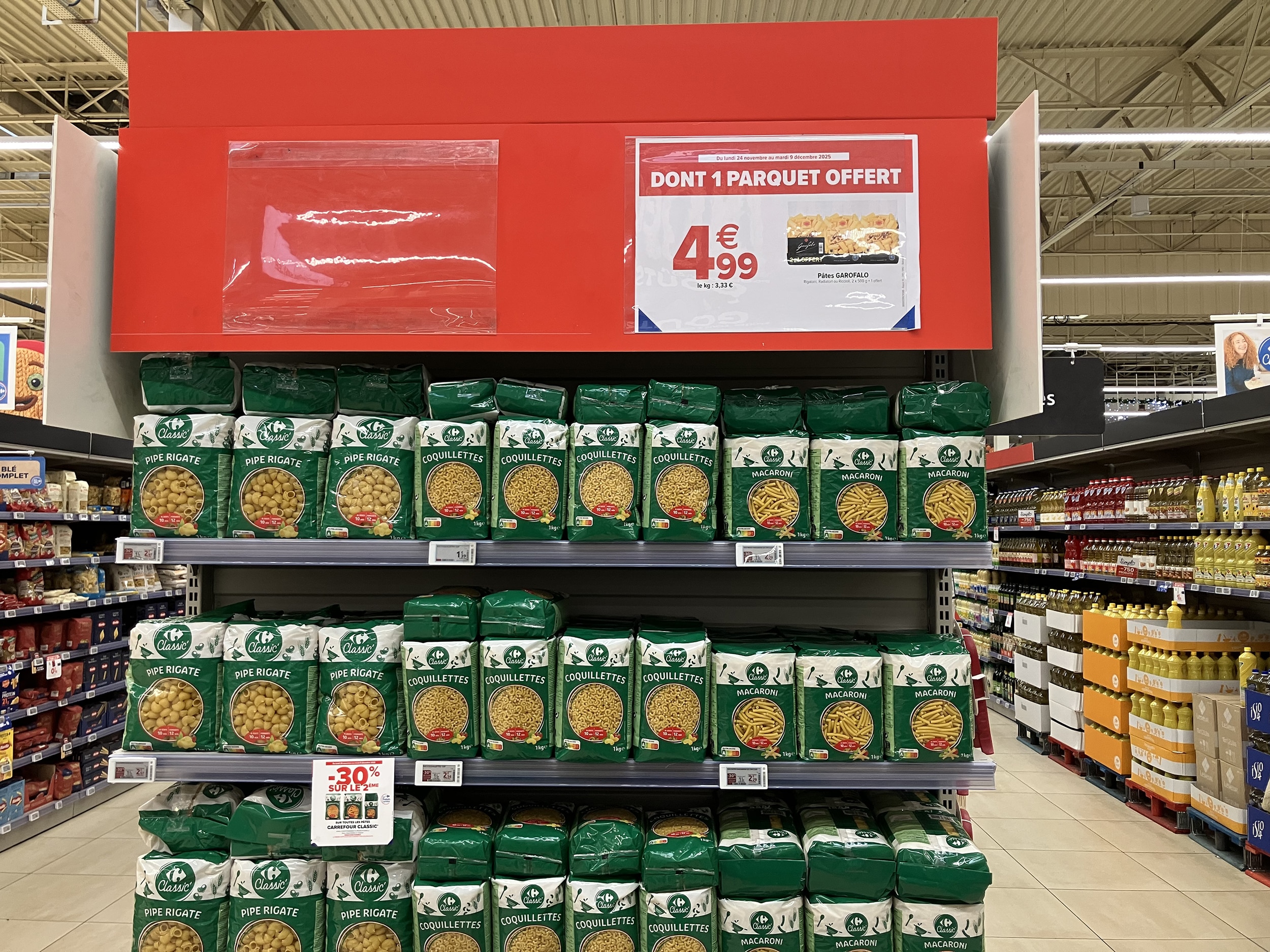 Promo sur les pâtes chez Carrefour. « 1 parquet offert ». Stratifié ou naturel ?
