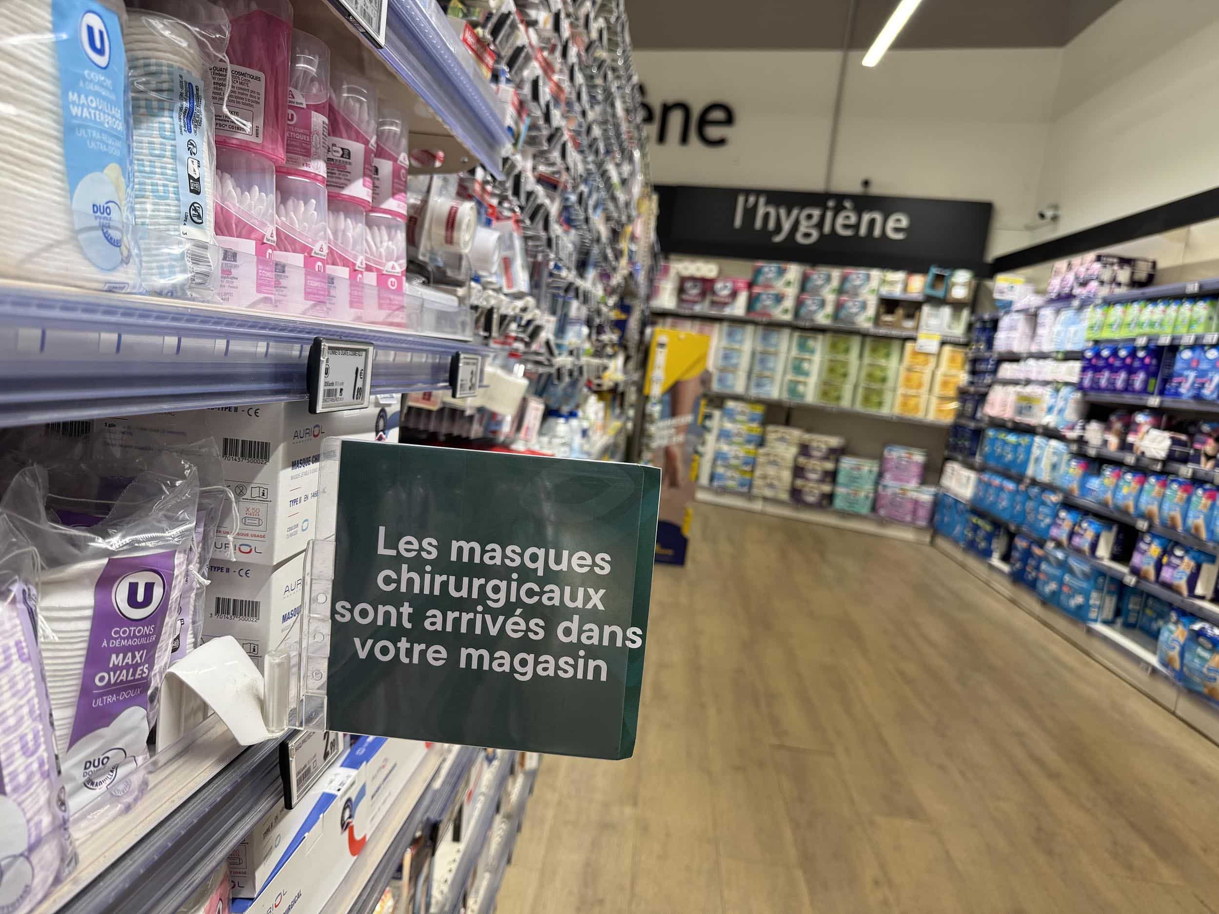 Super U Angers (49). Pour ceux qui cherchaient désespérement des masques chirurgicaux… ! Ils sont arrivés, youpi. Ne me dites pas que l’affichage a… 5 ans ???
