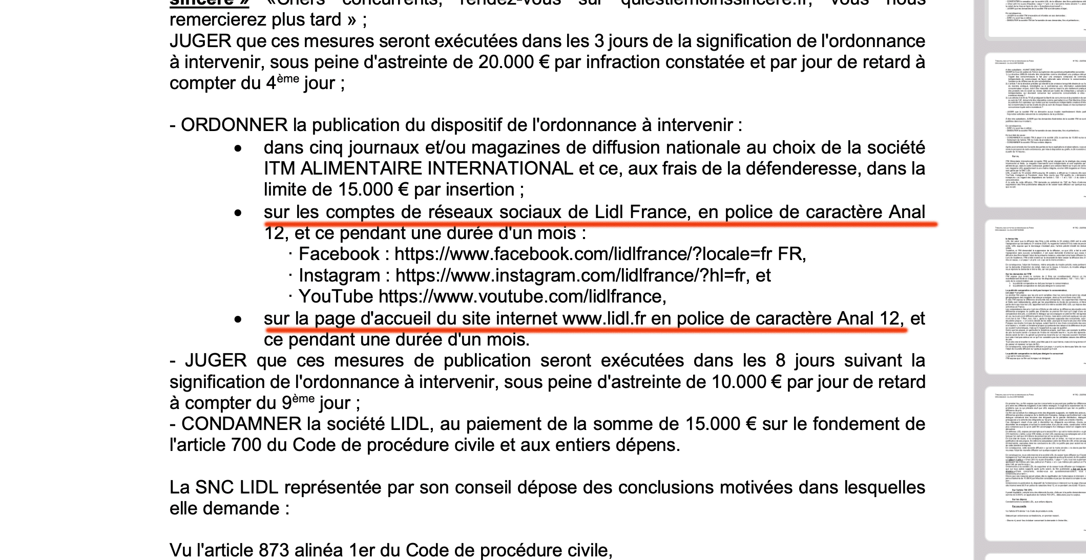 Intermarché fait condamner Lidl pour dénigrement (revoir ici). Dans l’ordonnance de jugement, l’obligation de publier la sentence. En police de caractère… « Anal ». Pour que ça fasse encore plus mal par où ça passe ?