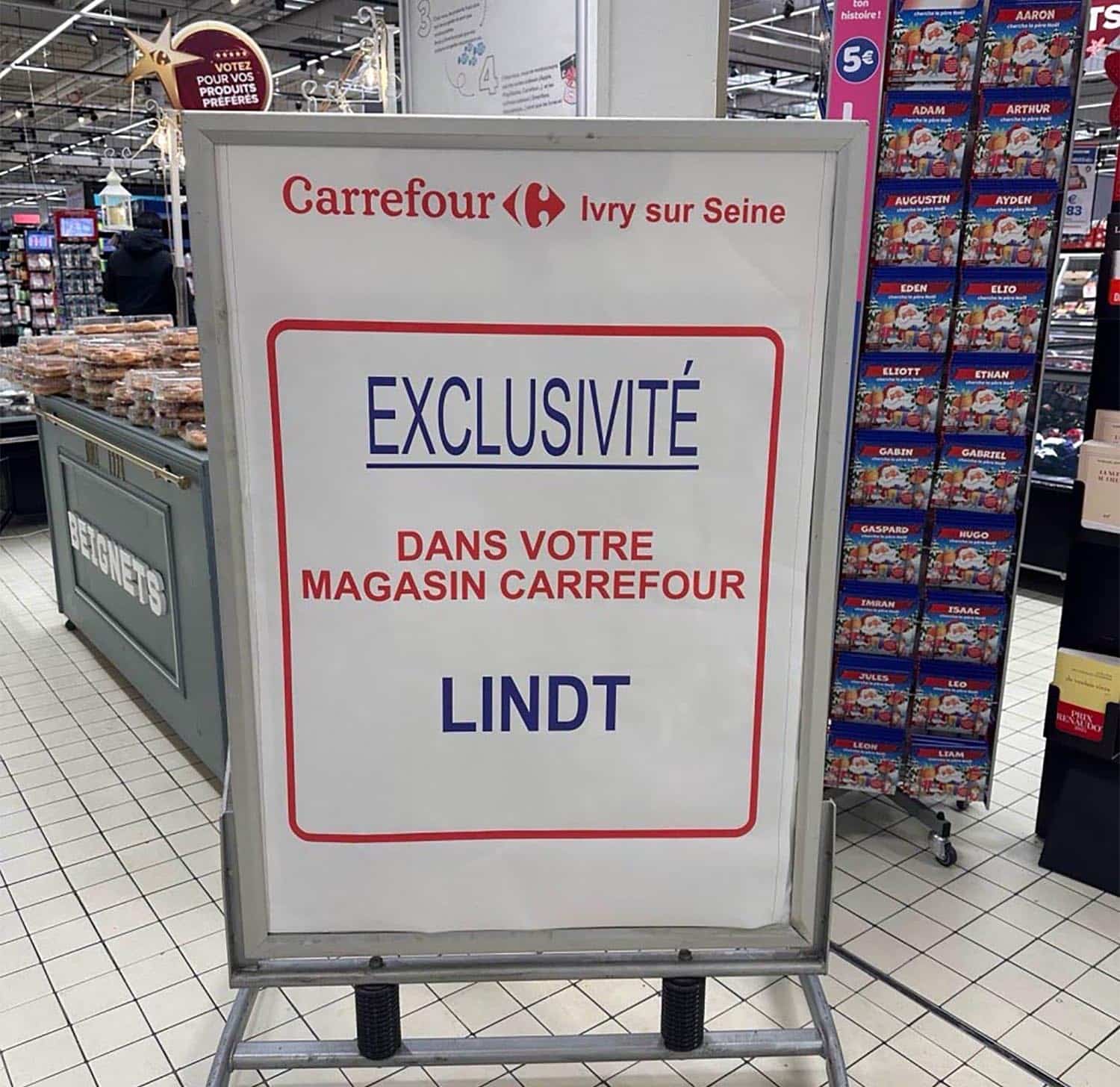 Chez Carrefour. Où l’on a bien compris qu’il n’y a pas de Lindt dans le cas d’en face (comprendre : les « Bleus » de Leclerc !). De là à en faire une exclu…