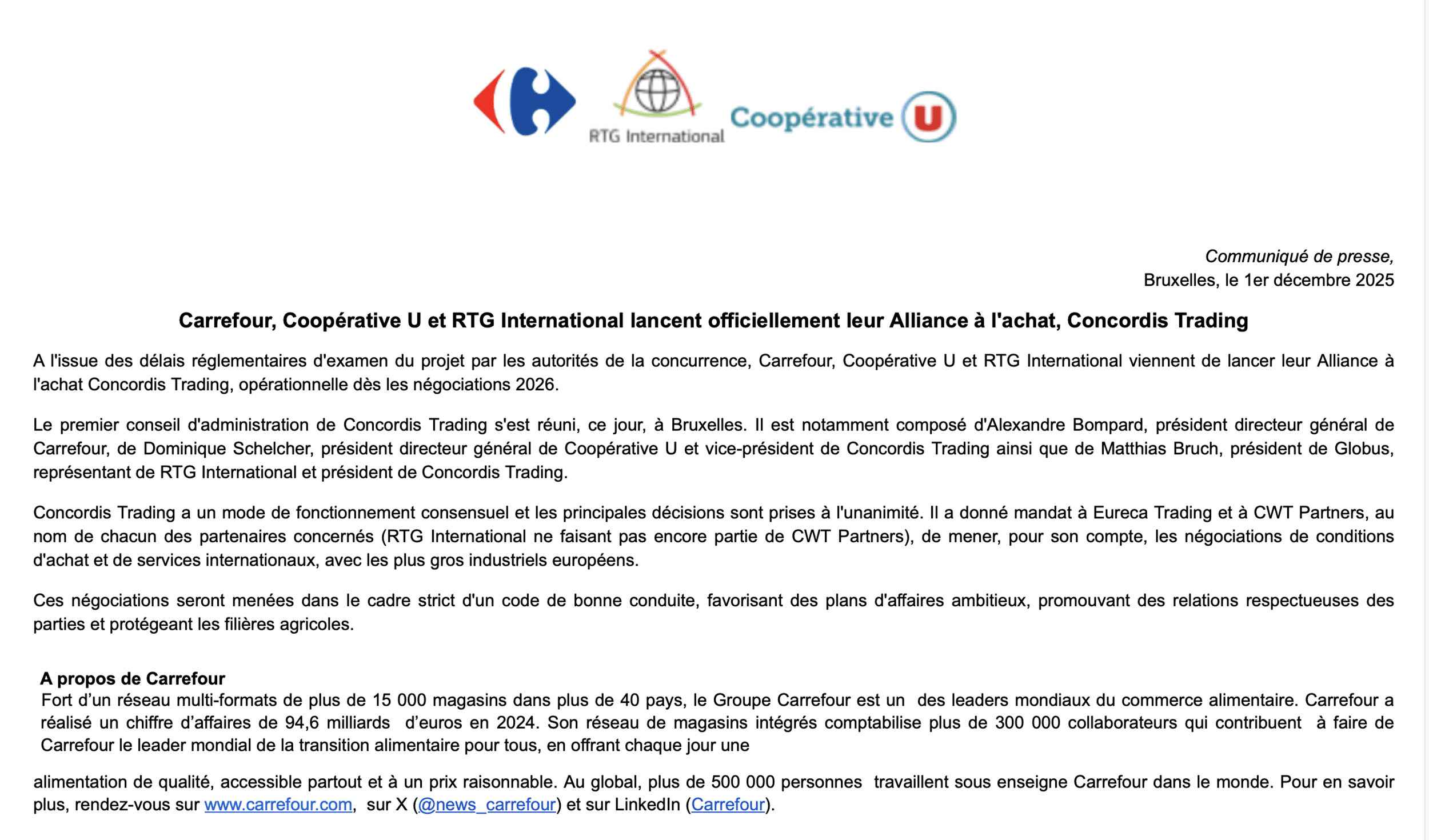 Carrefour, Coopérative U et l’Allemand RTG lancent officiellement leur centrale d’achats commune : Concordis. A Bruxelles. C’est fou comme Bruxelles attire… Ne me dites pas que c’est que pour le Thalys et le Manneken-Pis ?