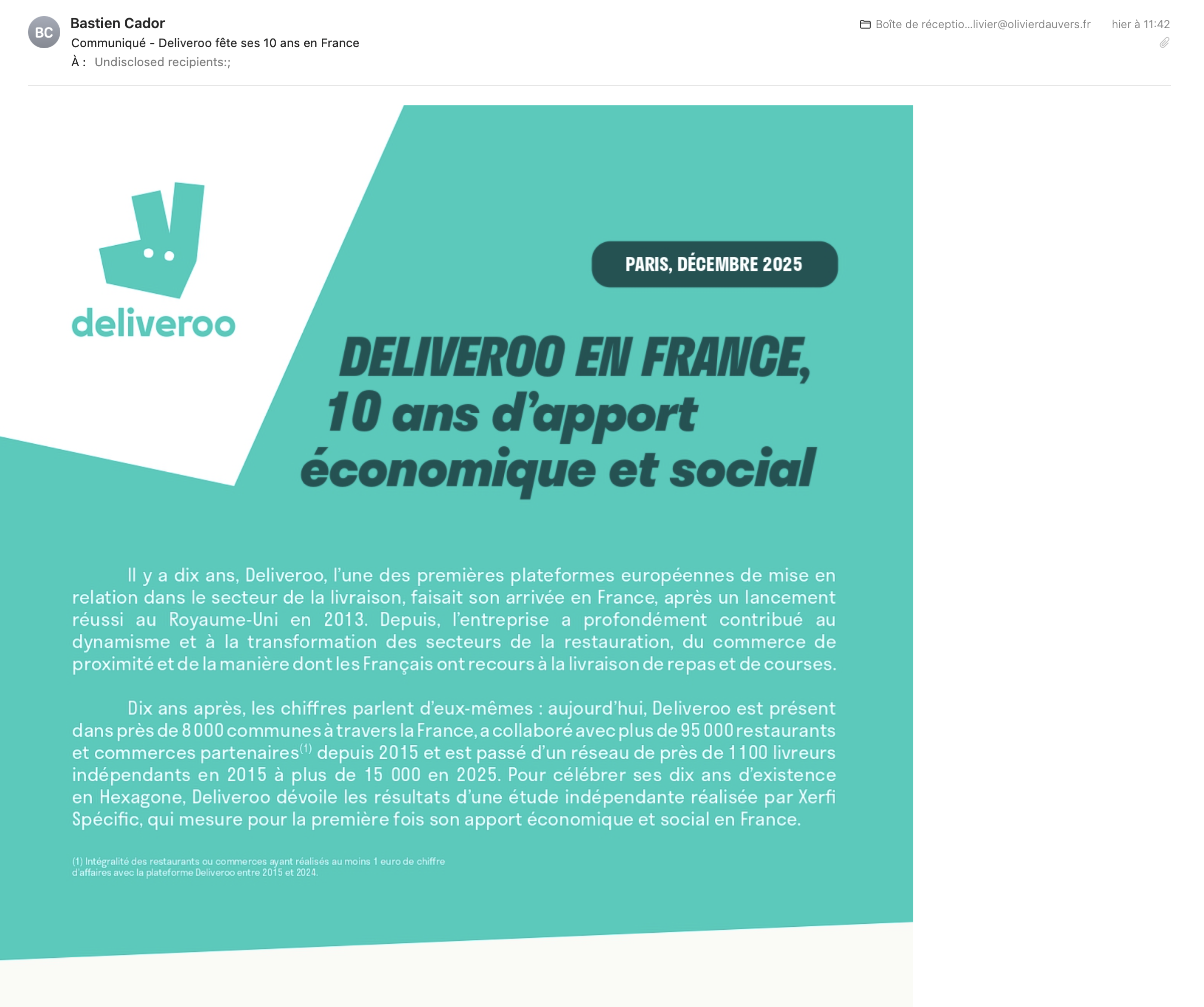 Deliveroo fête ses 10 ans en France. « 10 ans d’apport économique et social » résume la plateforme (souvent critiquée pour son modèle social). Beau à en pleurer. Sortez vos mouchoirs.