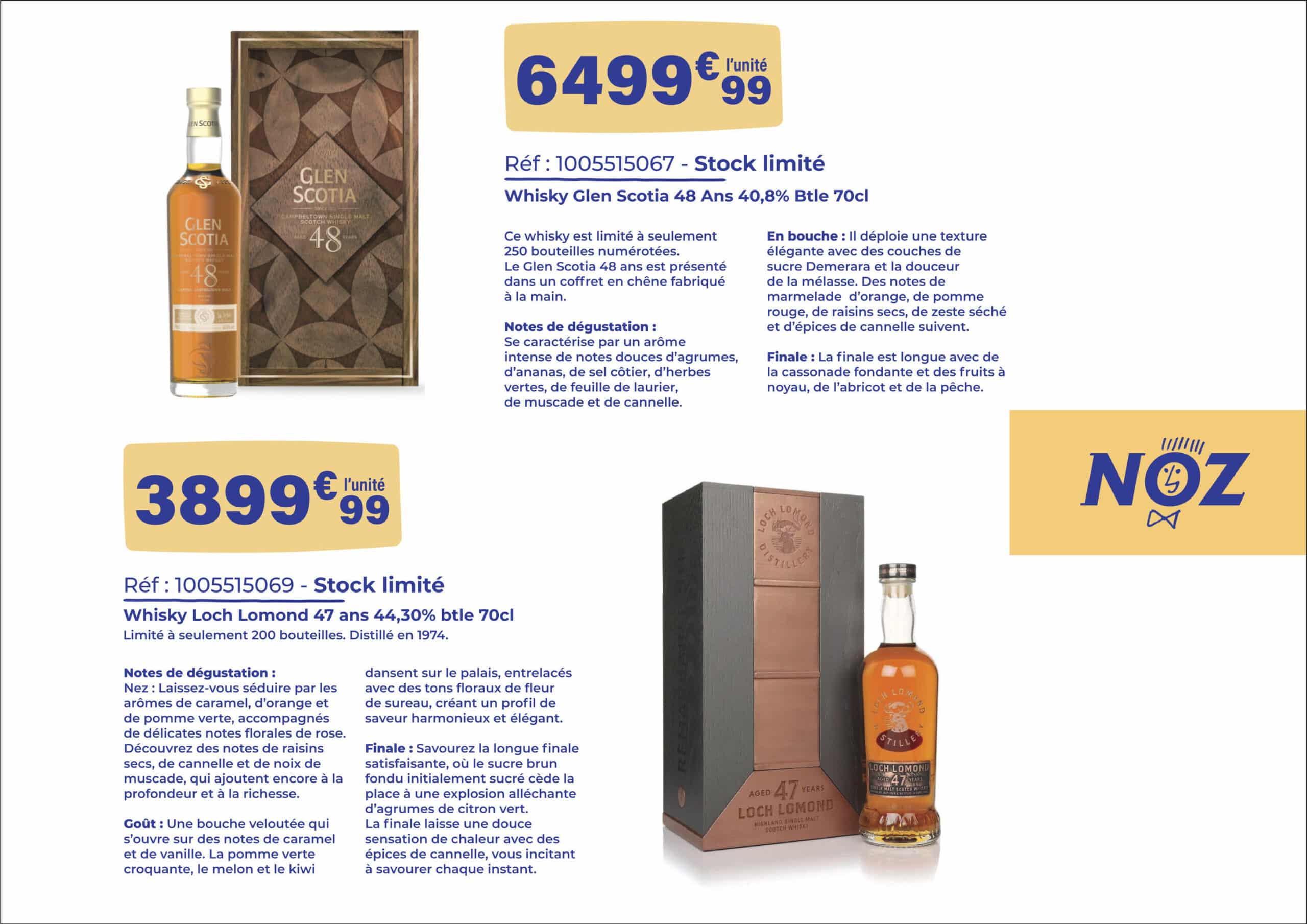 Si vous êtes déçu d’avoir raté le bon plan, consolez-vous. Noz a encore 3 bouteilles de Loch Lomond 47 ans à céder pour la modique somme de 3 900 € pièce. J’vous glisse ce bon plan en loucedé, le pancartage n’est pas encore installé en magasin (là encore, c’est pas une blague). Il faudra donc “acheter sur affiche” et patienter 8 jours la mise à disposition du précieux flacon au magasin : c’est la procédure classique de l’enseigne pour les produits très exclusifs (onéreux ou volumineux).