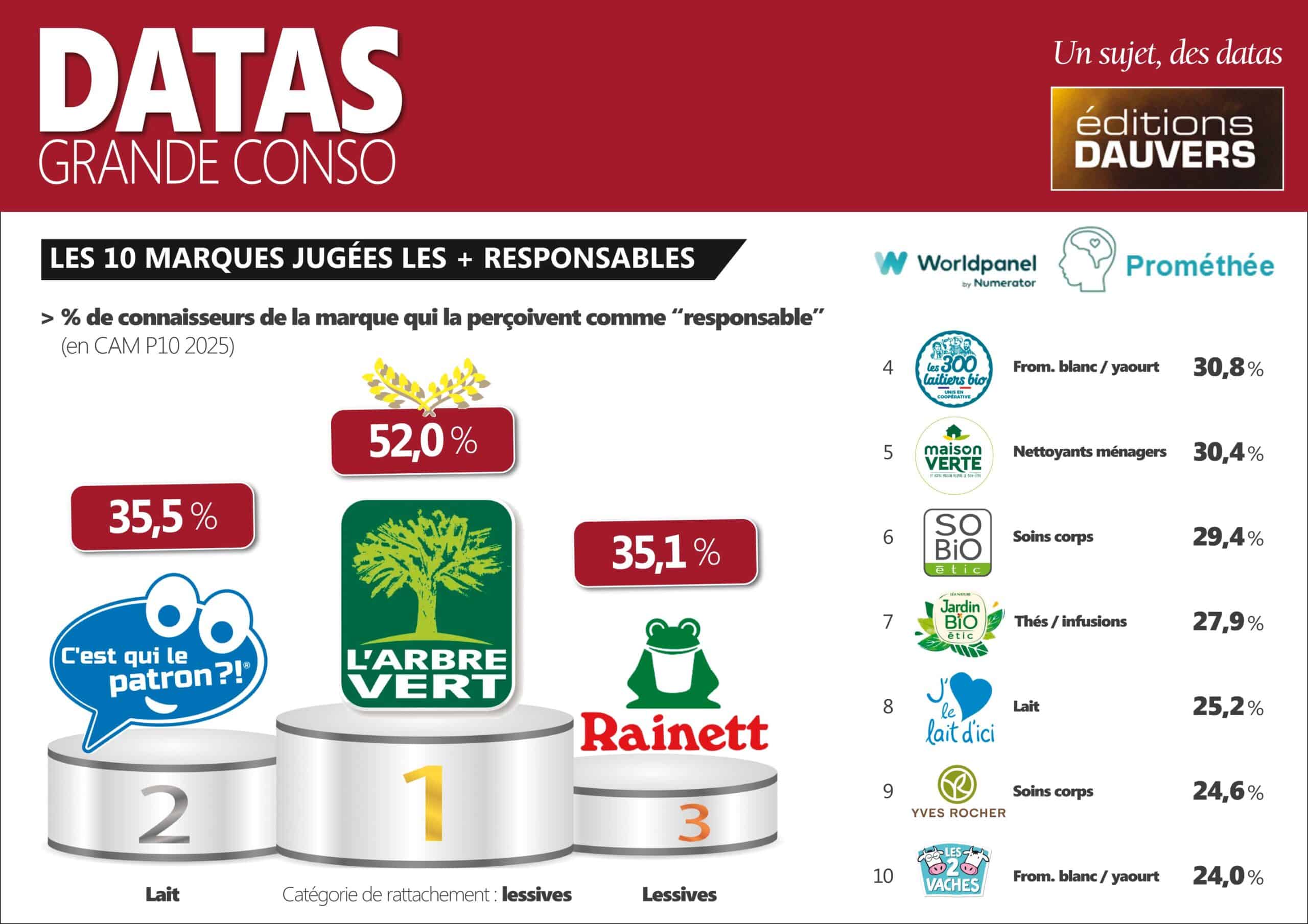Au-delĂ , l’essentiel du Top 10 est constituĂ© de marques bio et/ou Ă©cologiques. Normal ! Ces marques portent en elles les gĂȘnes de la responsabilitĂ©. Deux exceptions : C’est qui le Patron et J’aime le lait d’ici. Deux marques sur un mĂȘme marchĂ© (le lait), mais deux marques trĂšs diffĂ©rentes dans leur fondement comme dans leur positionnement prix. C’est qui le patron garantit une haute rĂ©munĂ©ration Ă  l’Ă©leveur et se positionne en haut de l’Ă©chelle de prix alors que “J’aime le lait d’ici” signe les briques premiers prix. Mais avec une promesse de proximitĂ© (qui n’est d’ailleurs pas argumentĂ©e). Ce qui, en creux, rappelle bien que l’essentiel est toujours la perception, pas la rĂ©alitĂ©. On peut le regretter mais c’est ainsi !