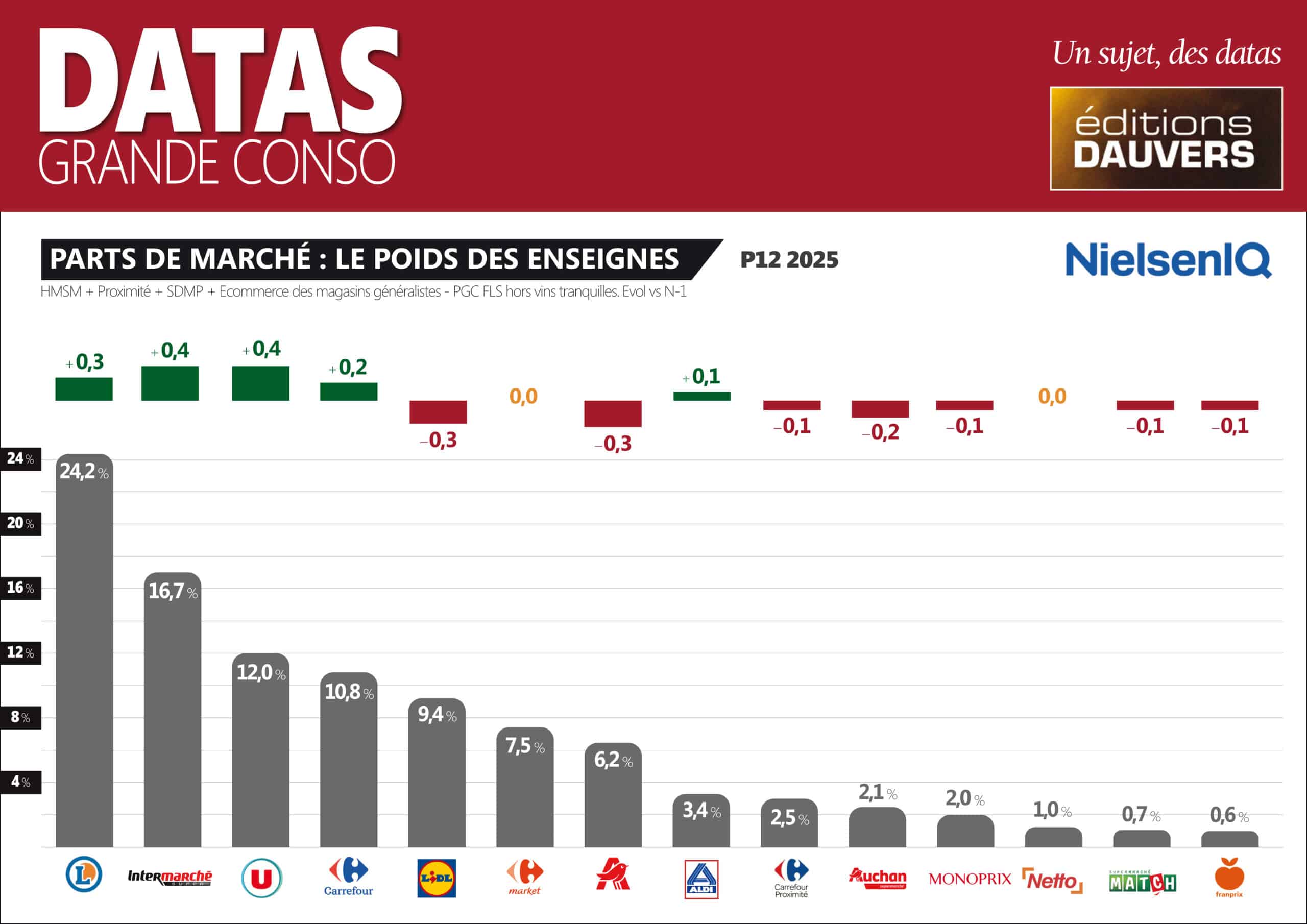 Parts de marché P12 NielsenIQ : un podium 100 % indépendant (et les hypers qui sauvent Carrefour !)