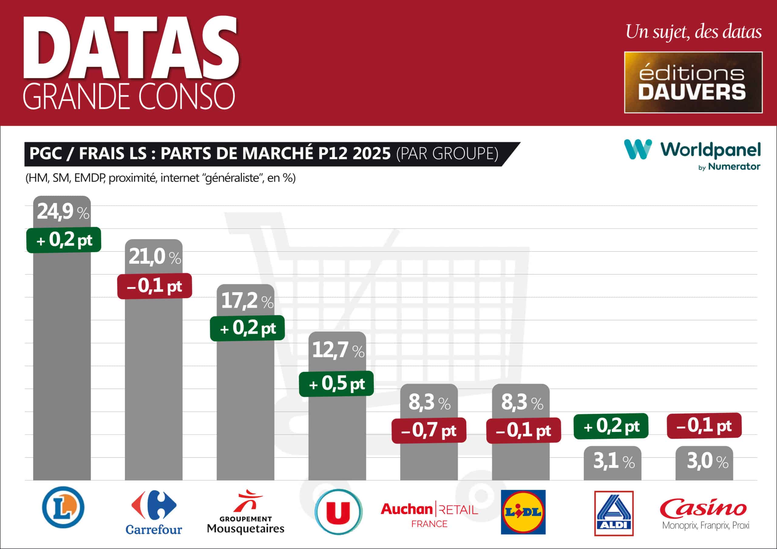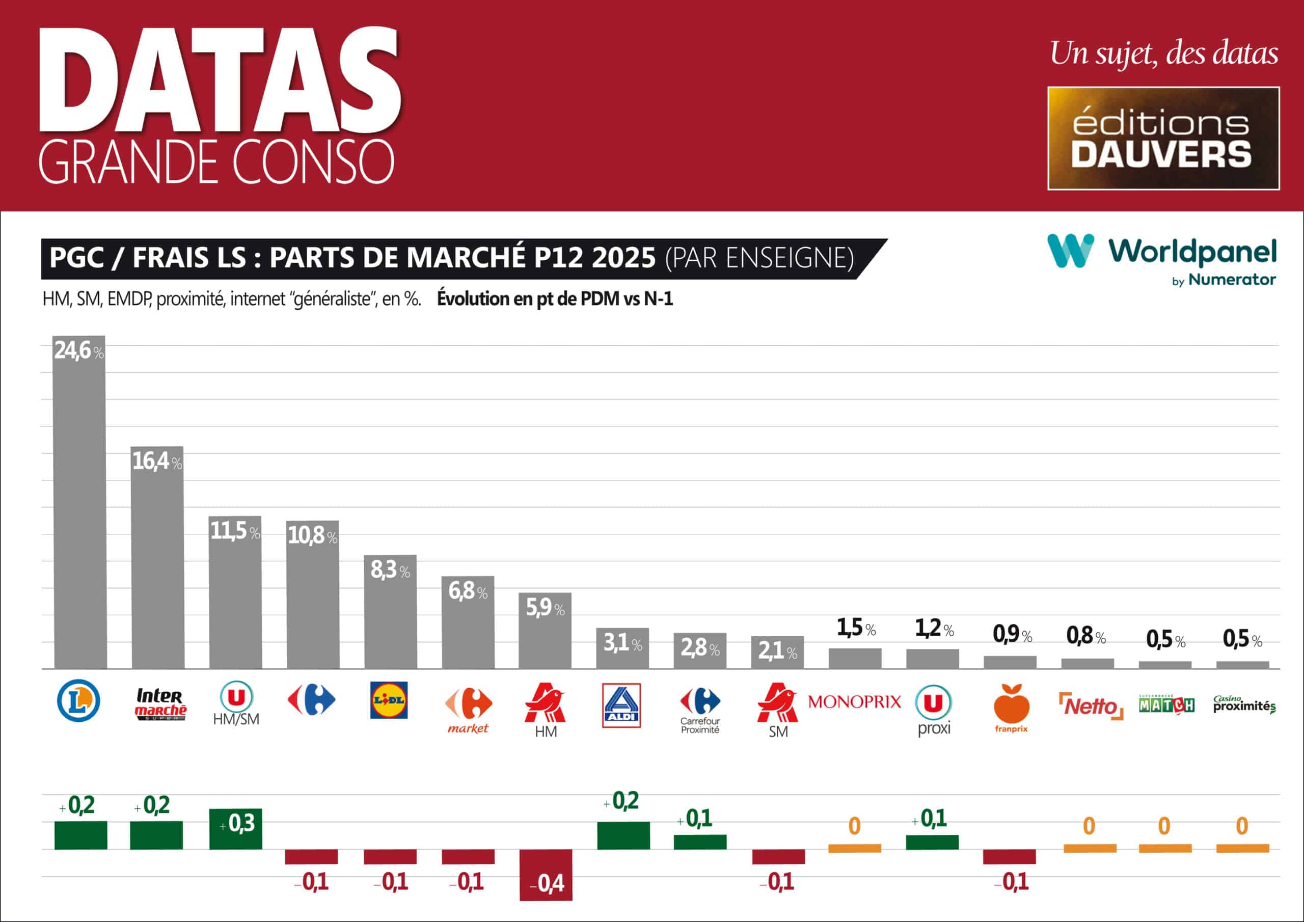 Après les parts de marché NielsenIQ (que j’ai révélées ici ce matin), voici donc la version Worldpanel. Et j’imagine aisément que chez Carrefour et Auchan on doit préférer la version NielsenIQ 😉 . Worldpanel pointe les mêmes “vainqueurs” de la période : les trois indépendants (Leclerc, Intermarché et U) et Aldi. Différences en revanche sur le sort réservé à Auchan et Carrefour. Les hypers Carrefour par exemple : + 0,2 pt d’un côté, – 0,1 pt de l’autre. Forcément, un recul est moins plaisant à regarder en réunion ! Même punition pour Auchan avec une vision plus pessimiste de Worldpanel : – 0,7 pt sur la période vs – 0,5 pt. Un recul dans les deux cas, mais à – 0,7 pt ça frise la correctionnelle. Là aussi, moins plaisant à regarder en réunion !
