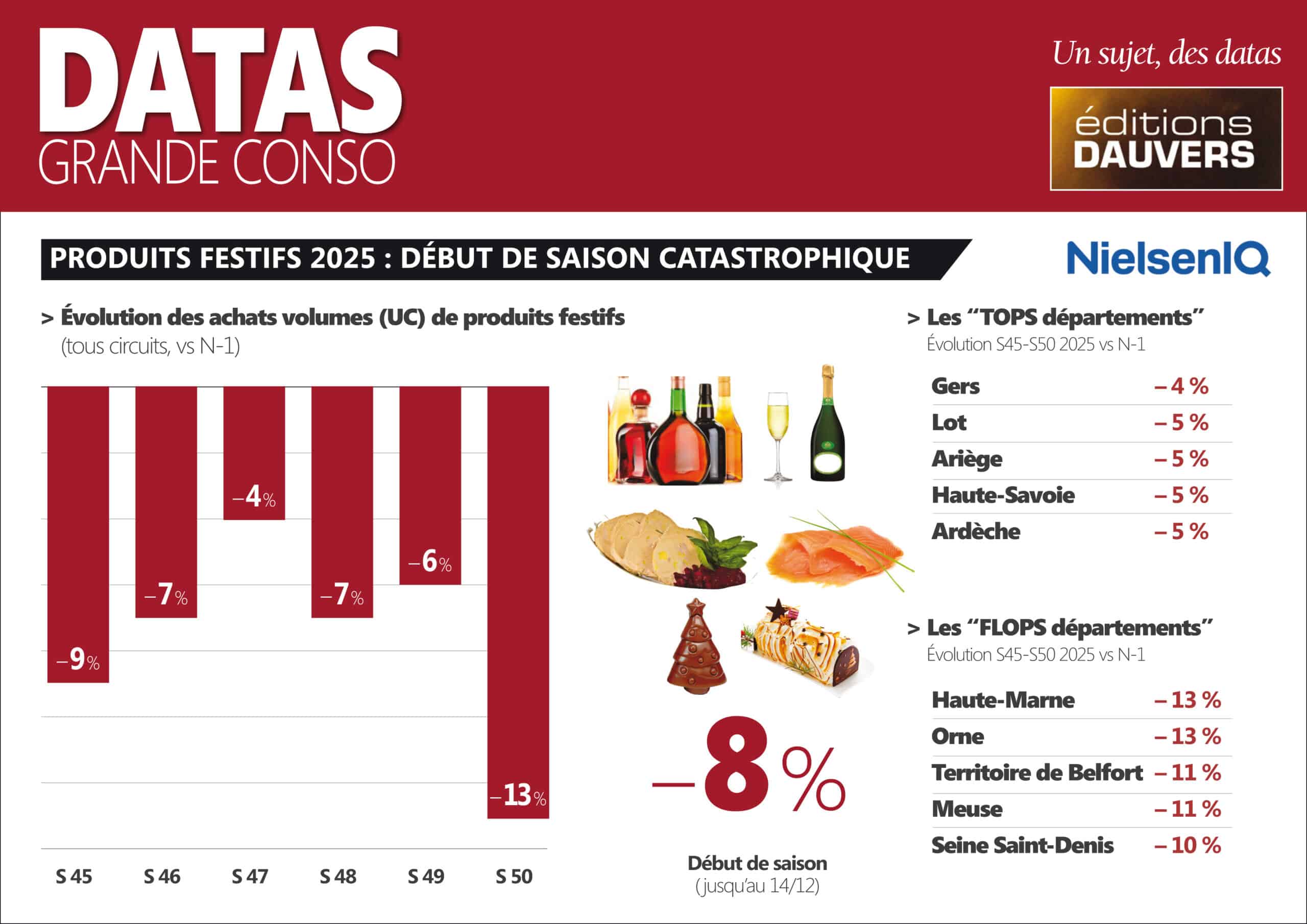 Catastrophique début de saison 2025 pour les produits festifs ! NielsenIQ a publié aujourd’hui la première tendance Noël 2025. Et pas la peine de faire semblant… : c’est mauvais, très mauvais même. Le nombre d’articles vendus dans les catégories festives est en recul de 8 %. Énorme ! Et même si les chiffres d’affaires ne reculent “que” de 4 % (merci l’inflation sur les chocolats !), voilà un mauvais indicateur pour l’état de la conso. Les Français abordent donc Noël le pied sur le frein, alors qu’habituellement on présentait les agapes de fin d’année comme une bulle préservée. Ça n’est manifestement pas le cas cette année. Certes, il manque encore les semaines 51 et 52 dans ce bilan (qui pèsent quand même 40 % du “festif”), il n’empêche : la probabilité d’une saison positive est désormais une utopie.