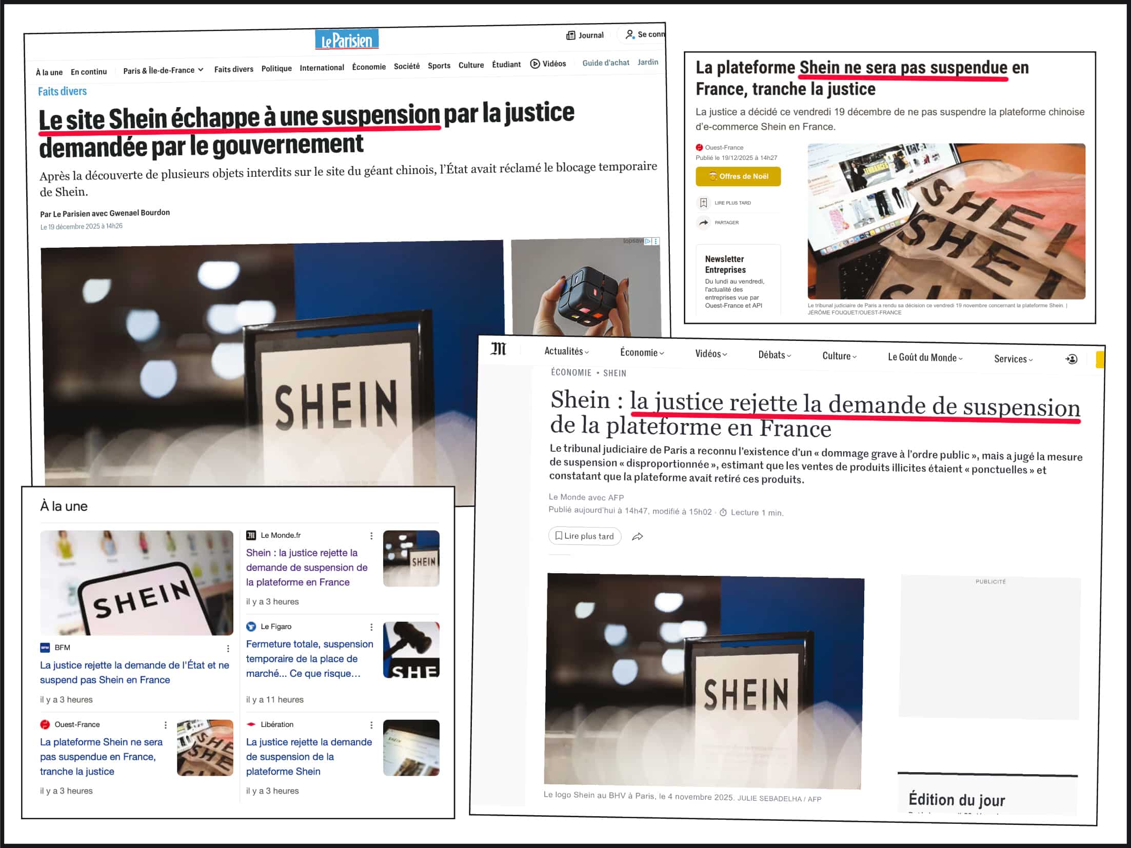 Un chapitre s’est refermé aujourd’hui dans la série « Shein, ton univers impitoyable ». Le tribunal de Paris n’a donc pas suivi l’État (en clair Bercy) dans sa demande de suspension de la plateforme chinoise.