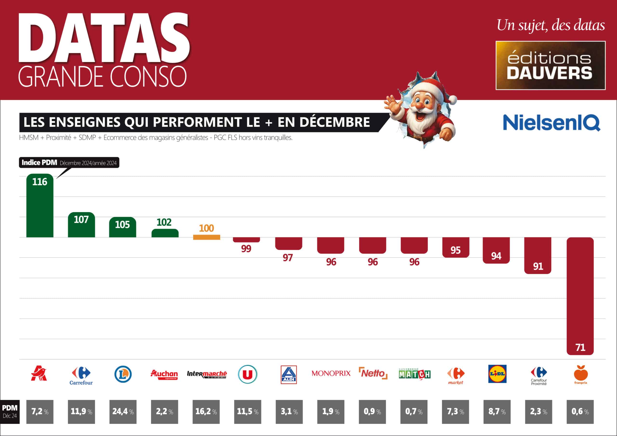 Pour autant, la sur-performance des hypers est nette et s’explique précisément par ce qui reste la force de l’hyper : la surface XXL qui permet un choix plus large et une théatralisation en conséquence, à laquelle se rajoute l’intérêt pour le non-al sur la période (jouets, déco, cadeaux, etc.). A l’inverse, la proximité est nettement sous-performante. Voire très sous-performante dans le cas de Franprix, en raison de ses implantations franciliennes et des… transhumances hivernales !